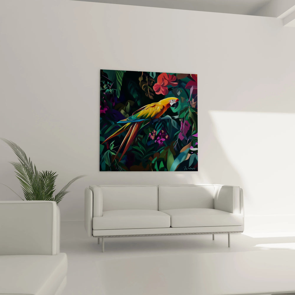 Ce tableau perroquet révèle un ara aux-bleu magnifique posé gracieusement au cœur d'une végétation tropicale exubérante. L'oiseau domine la composition avec son plumage éclatant aux nuances dorées et turquoise, créant un point focal saisissant. La première impression visuelle frappe par l'intensité chromatique et la richesse des détails botaniques qui entourent ce tableau perroquet jungle tropicale. Les proportions parfaitement équilibrées révèlent un ara de taille imposante, ses plumes minutieusement détaillées captant la lumière avec un réalisme frappant. L'élément distinctif immédiatement visible réside dans l'harmonie parfaite entre le sujet principal et son environnement naturel, transformant cette œuvre en véritable fenêtre sur l'Amazonie.