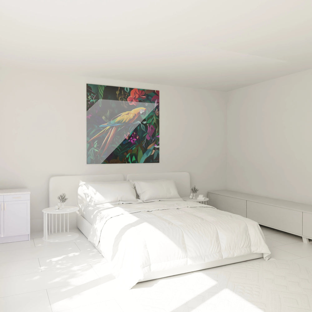 L'expérience visuelle de ce tableau perroquet perspective immersive se transforme selon la distance d'observation, révélant des richesses insoupçonnées. À distance, l'effet global frappe par l'harmonie d'ensemble et l'équilibre des masses colorées qui composent cette scène tropicale. L'examen rapproché dévoile une multitude de détails fascinants : les striures individuelles des plumes, les nervures délicates des feuilles, les gradations subtiles des ombres portées. La profondeur s'établit grâce à un travail minutieux sur les plans successifs, créant une sensation d'immersion dans l'habitat naturel. Cette œuvre perroquet amazonie détaillée bénéficie d'un traitement en plusieurs couches visuelles qui enrichissent l'expérience contemplative. Les mots-clés de niche ultra-spécifiques comme "tableau perroquet plumes irisées lumière tropicale" caractérisent parfaitement cette richesse dimensionnelle unique.