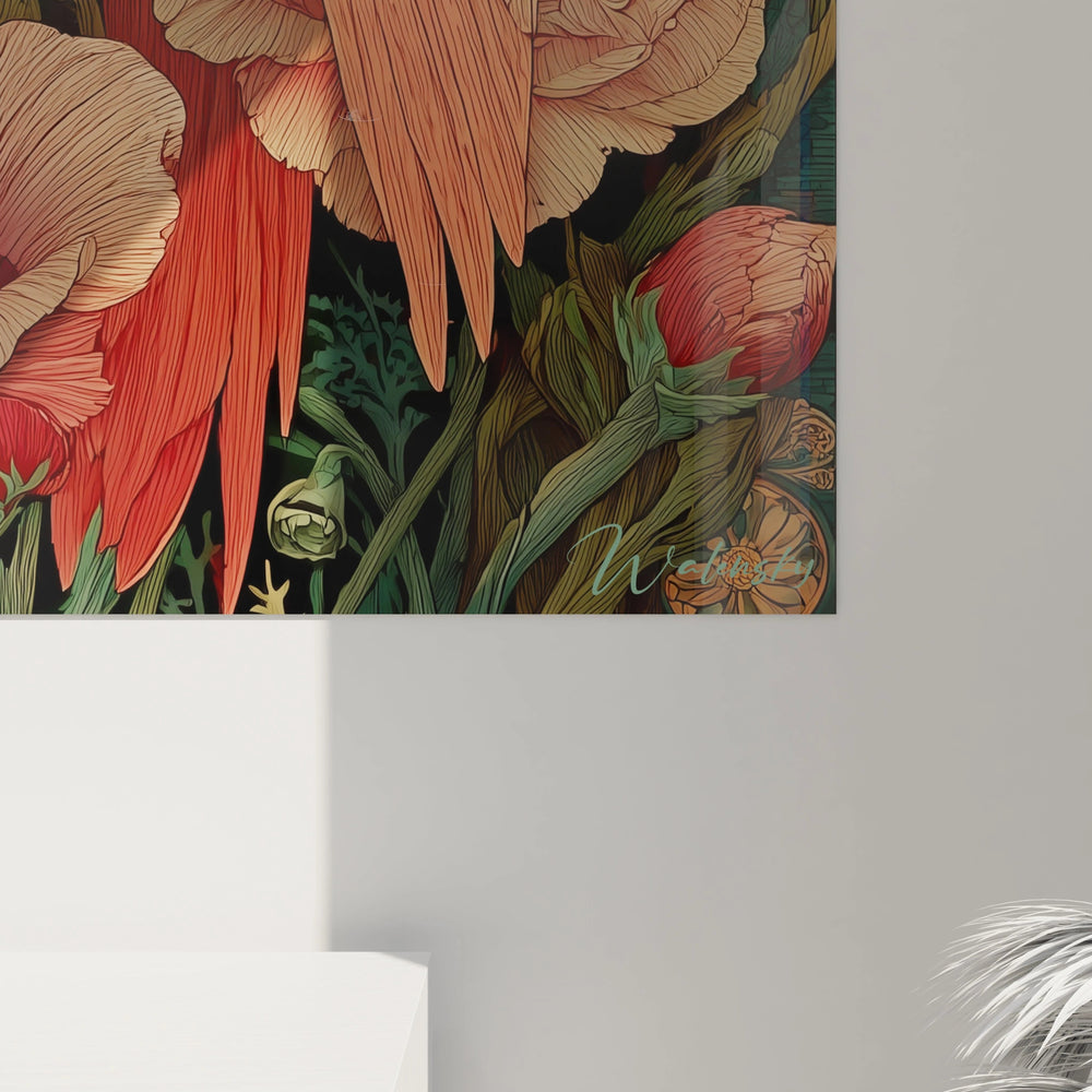 Cette œuvre présente un tableau perroquet d'une élégance rare, où un oiseau au plumage nacré trône majestueusement au centre d'une composition florale somptueuse. Le perroquet blanc aux reflets corail capture immédiatement l'attention par sa posture noble et son regard perçant. Cette décoration murale perroquet ornementale s'inspire clairement des codes esthétiques Art Nouveau avec ses motifs géométriques complexes et ses arabesques sophistiquées. L'ensemble dégage une atmosphère de sérénité et de raffinement, caractéristique des œuvres décoratives de cette période artistique emblématique.