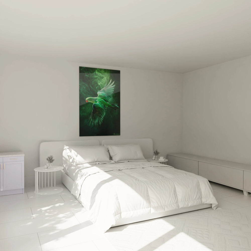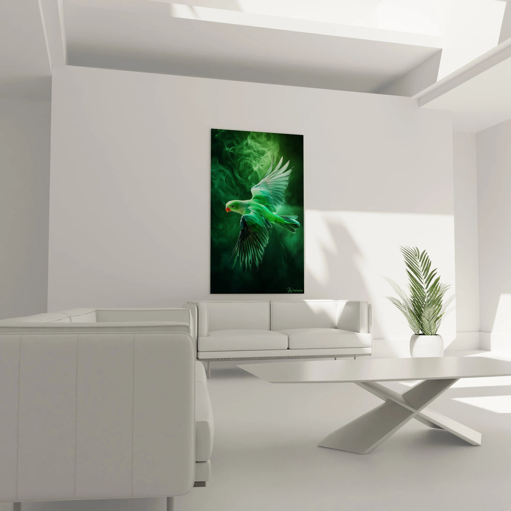 Chaque détail de ce tableau est pensé pour éveiller vos sens : les nuances vives de vert et turquoise font vibrer le plumage, tandis qu’une douce émanation de fumée éthérée enveloppe l’oiseau, lui donnant presque vie sous vos yeux. Vous êtes transporté dans un univers onirique, où la perruche déploie ses ailes avec une grâce presque surnaturelle, symbolisant la liberté et la beauté sauvage que vous souhaitez insuffler à votre intérieur.