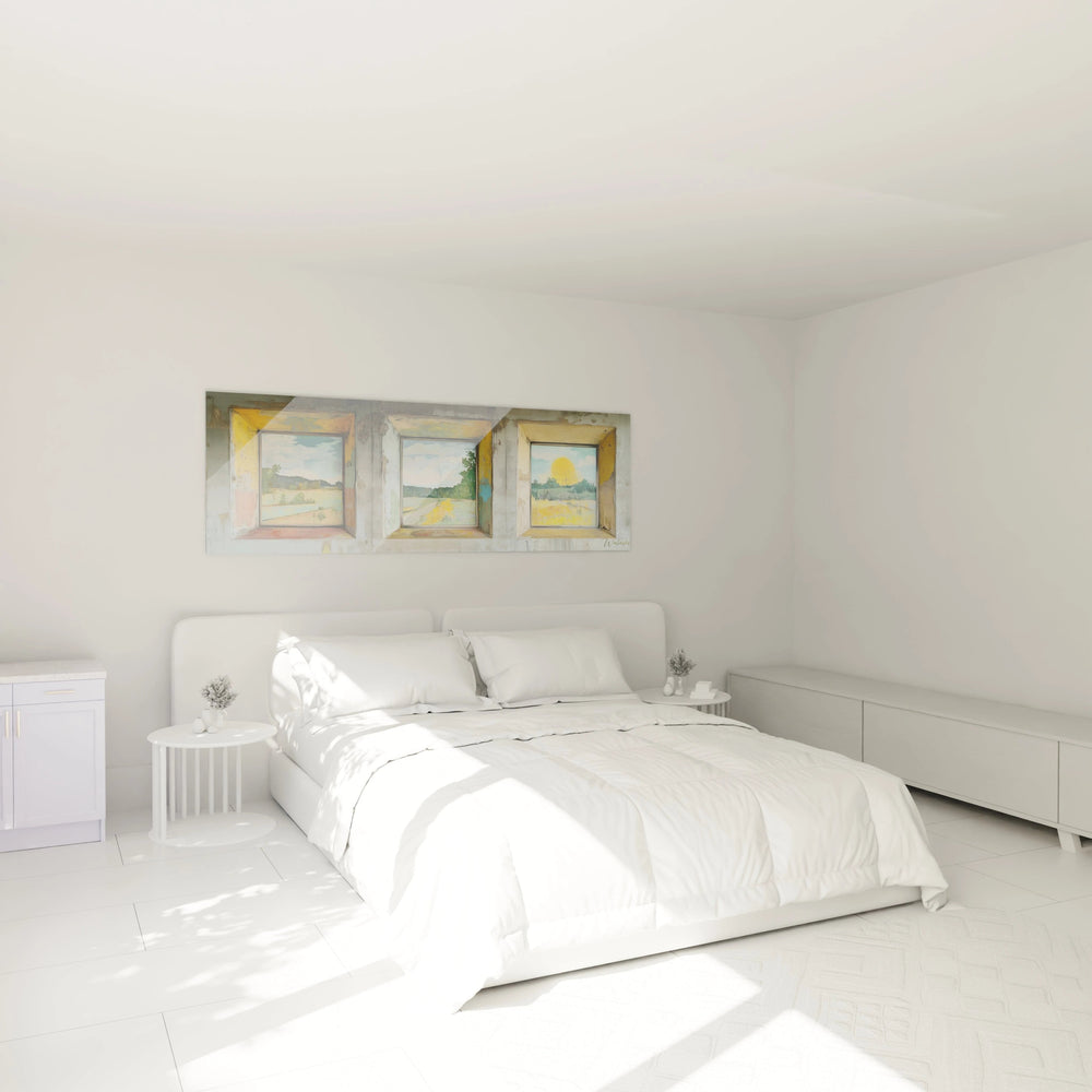 Imaginez un instant déambuler devant ce triptyque captivant, où les teintes dorées du matin se fondent dans les bleus profonds du midi, jusqu’aux reflets orangés d’un coucher de soleil intense. Chaque cadre, avec sa texture rugueuse évoquant les murs urbains patinés par le temps, encadre ces paysages avec une énergie vibrante. Cette fusion entre l’authenticité rustique et l’audace du street art révèle une narration visuelle qui transcende les espaces et les styles.