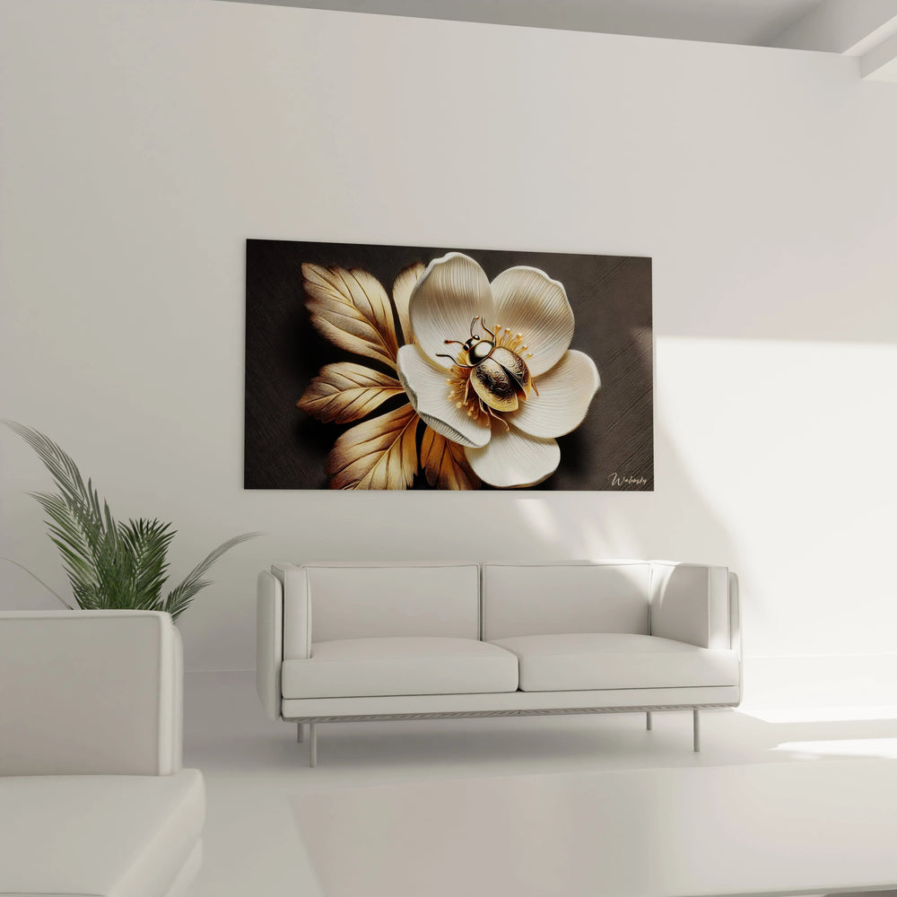 Chaque détail de ce tableau respire la délicatesse. La coccinelle, sublimée par des reflets dorés et métalliques, brille comme un joyau rare posé sur une fleur aux pétales satinés, d’un blanc nacré rehaussé d’or. Cette composition monochrome sophistiquée crée une atmosphère apaisante et précieuse, parfaite pour insuffler une sensation de calme et d’émerveillement dans votre espace.