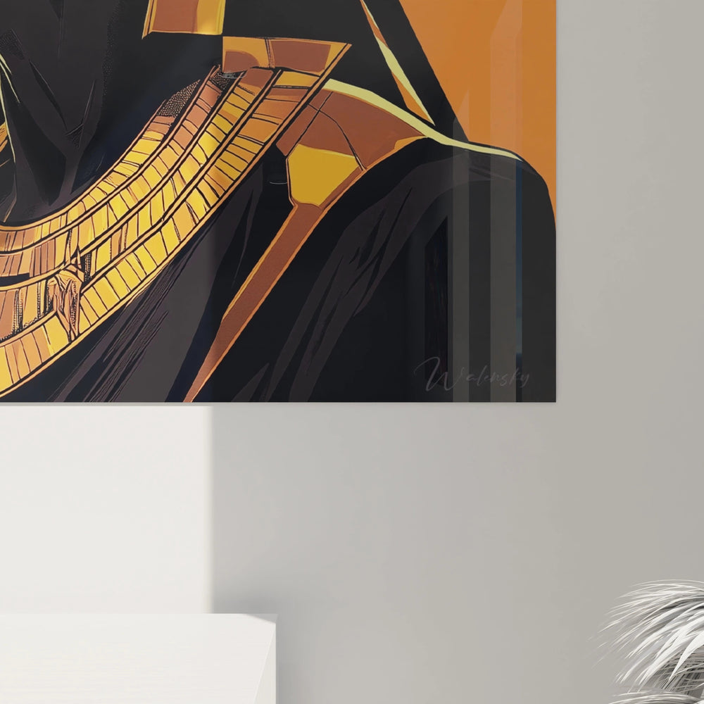 Cette œuvre magistrale trouve sa place idéale dans des environnements où sa prestance peut pleinement s'exprimer. Un éclairage indirect met parfaitement en valeur les contrastes chromatiques et les détails dorés sans créer de reflets gênants. Les murs de couleur neutre, beige ou blanc cassé, constituent un écrin parfait pour cette décoration murale pharaon majestueuse. L'association avec des éléments décoratifs aux tons terre, cuivre ou bronze crée une harmonie parfaite. Cette œuvre s'épanouit particulièrement dans les espaces au caractère affirmé : salon principal, bureau de direction ou hall d'accueil. La richesse chromatique chaude de l'œuvre apporte instantanément une dimension luxueuse et raffinée à l'espace qu'elle habite.