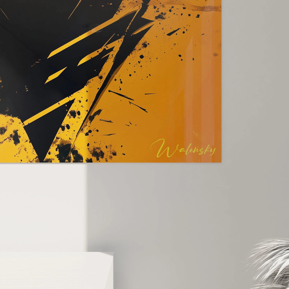 L'expérience visuelle de cette œuvre évolue considérablement selon la distance d'observation, révélant différents niveaux de lecture artistique. À distance, le tableau pharaon impact visuel global frappe par sa puissance chromatique et sa composition équilibrée, le contraste orange-noir créant un effet dramatique immédiat. L'approche rapprochée dévoile une multitude de détails fins : les textures gravées du némès, les micro-reliefs du visage royal, les subtilités des ombrages qui sculptent les volumes. Les projections d'encre révèlent à l'examen attentif une gestuelle contrôlée qui participe à l'équilibre général de la composition. Cette œuvre pharaon multi-niveaux lecture récompense autant l'observation contemplative à distance que l'analyse détaillée de proximité. L'effet global conserve sa cohérence quelle que soit la distance, témoignant d'une maîtrise technique qui intègre parfaitement macro et micro-compositions. La profondeur visuelle est accentuée par les jeux de transparence dans les éclaboussures qui créent plusieurs plans de lecture simultanés.