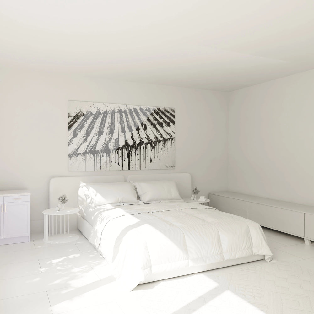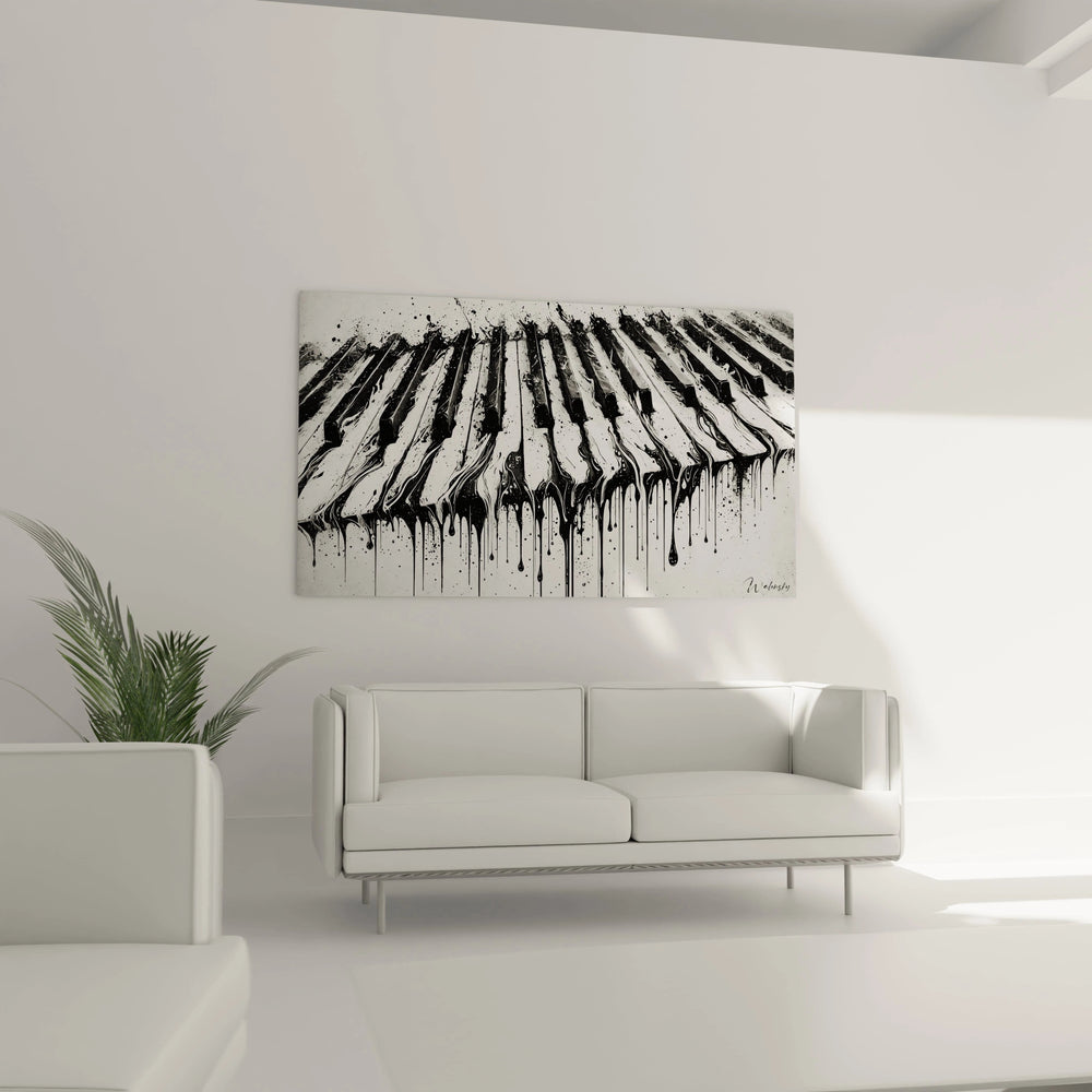 Chaque touche, représentée par des coulées fluides et des éclaboussures dynamiques, vous plonge dans un univers où la musique prend forme. En contemplant cette création, vous ressentez les contrastes intenses entre mélancolie et joie, silence et effervescence — une danse harmonieuse de noir, blanc et nuances de gris qui habille votre espace d’une atmosphère à la fois dramatique et apaisante.
