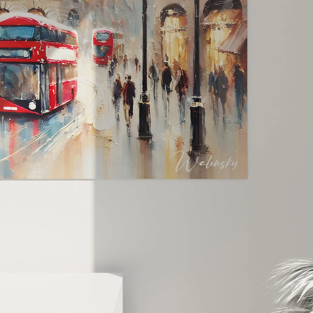 Imaginez la lumière dorée du crépuscule enveloppant les pavés humides, tandis que les silhouettes animées des passants se mêlent aux bus rouges emblématiques. Chaque coup de pinceau reflète la richesse des textures urbaines : les façades historiques aux tons beige délicats, les éclats de bleu apaisant du ciel londonien, le tout vibrant au rythme du quotidien. Ce tableau ne se contente pas d’illustrer une scène, il vous transporte dans une ambiance palpable où l’histoire danse avec la vie moderne.