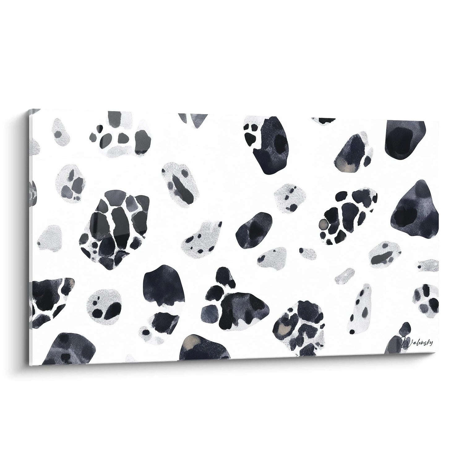 Ce tableau empreintes abstraites présente une composition fascinante de formes organiques dispersées sur un fond blanc immaculé. Les taches noires et grises créent un motif évocateur qui rappelle immédiatement des traces d'animaux, des empreintes de pattes ou des fragments de nature fossilisée. Cette décoration murale empreintes naturelles capture l'essence du mouvement figé dans le temps, où chaque forme semble raconter une histoire silencieuse. L'élément le plus distinctif réside dans cette alternance rythmée entre les zones d'intensité maximale et les espaces de respiration, créant une harmonie visuelle qui évoque la spontanéité contrôlée de la nature sauvage.
