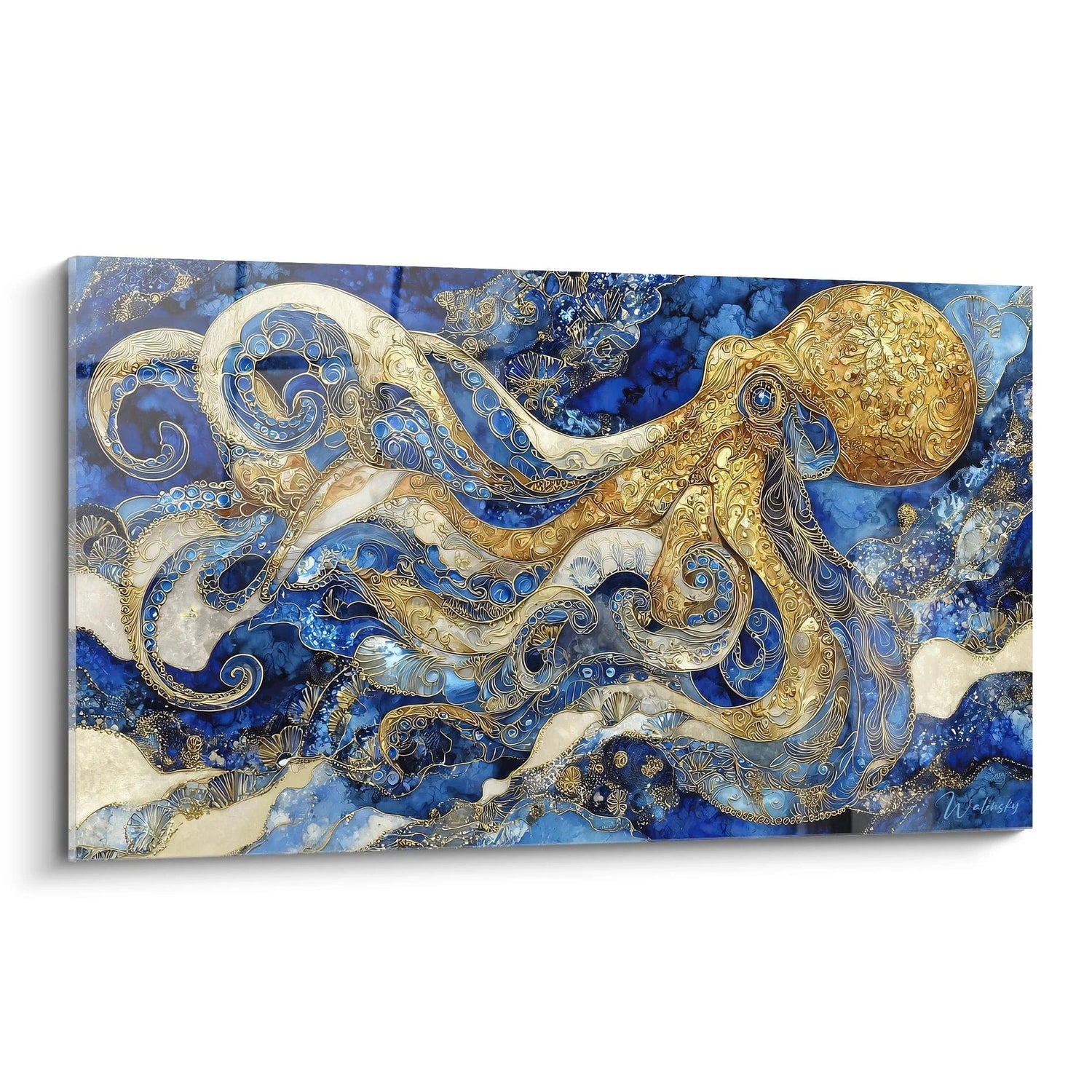 Tags : tableau pieuvre, art mural kraken, décoration marine, ornements dorés, bleu et or