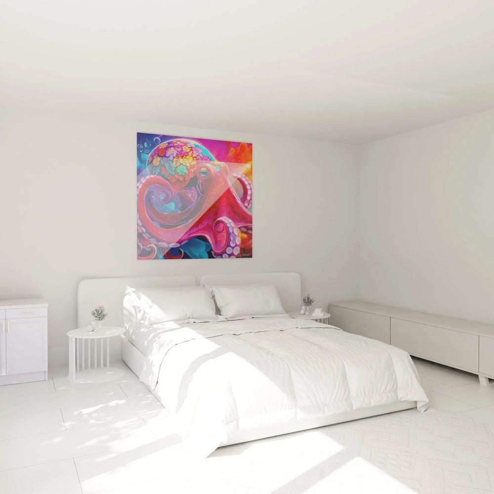 Ce tableau mural pieuvre présente une créature marine extraordinaire dans un style art psychédélique océanique saisissant. La pieuvre, majestueuse et colorée, déploie ses tentacules ornés de ventouses nacrées dans un ballet aquatique fascinant. Sa tête arbore un motif floral exceptionnel composé de fleurs tropicales stylisées aux teintes éclatantes : hibiscus roses, fleurs jaunes dorées et éléments turquoise qui créent un contraste harmonieux. L'œil de la créature, profond et mystérieux, captive le regard avec son iris sombre entouré de nuances orangées et rouges flamboyantes. Ce tableau décoratif marine transforme la pieuvre traditionnelle en une vision onirique où se mêlent réalisme anatomique et imagination artistique débordante. Les tentacules colorées serpentent gracieusement dans l'espace, créant une dynamique visuelle captivante qui évoque le mouvement perpétuel des fonds marins. Cette décoration murale océan unique capture l'essence mystérieuse des profondeurs tout en y ajoutant une dimension florale surprenante qui évoque les jardins sous-marins légendaires.