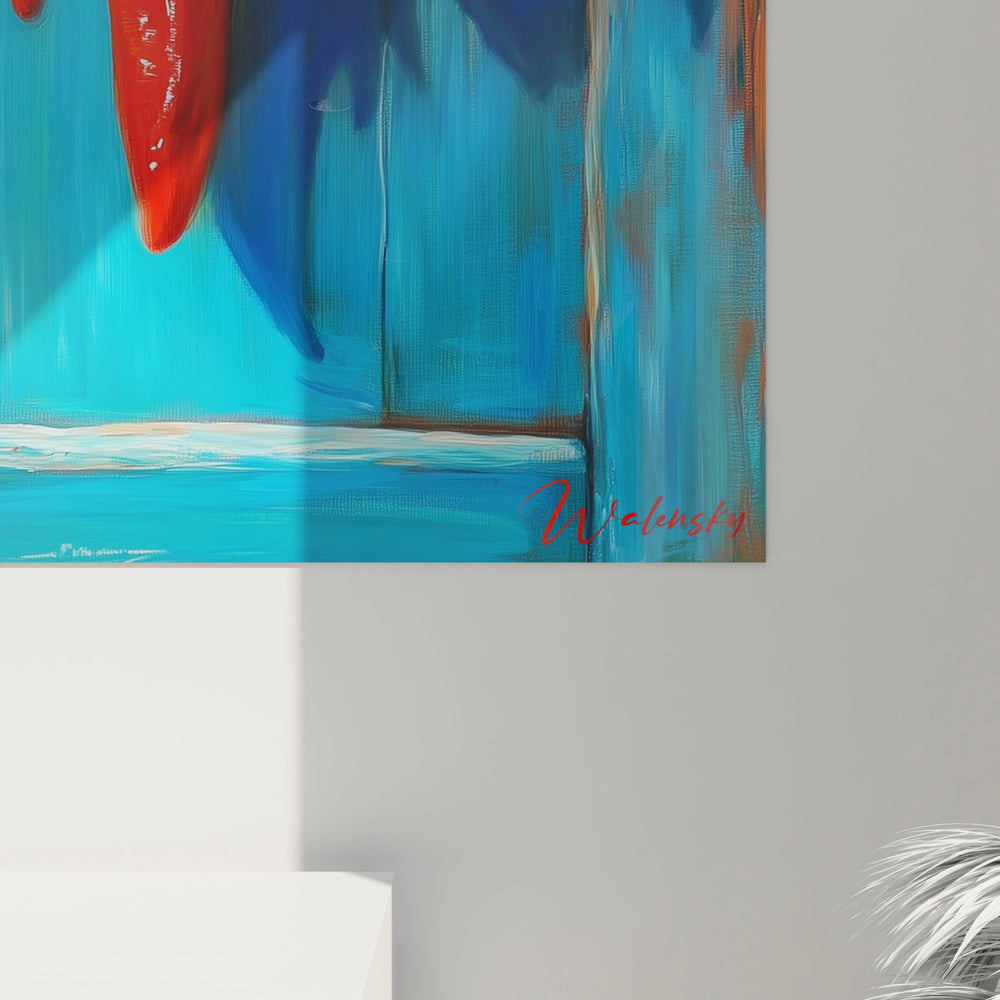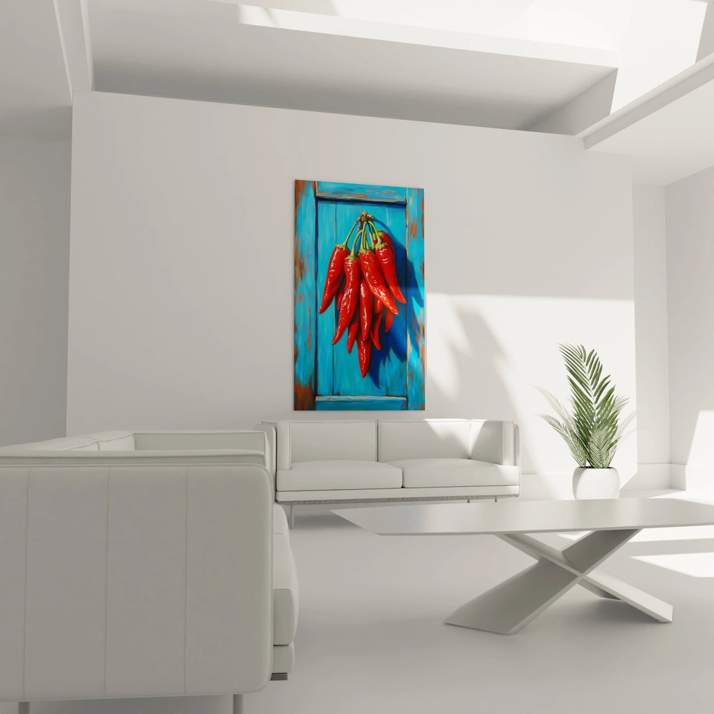 Chaque dĂ©tail de ce tableau soigneusement travaillĂ© capte la lumiĂšre comme un rayon caressant la surface lisse de ces piments flamboyants. Le contraste remarquable entre le rouge Ă©clatant des fruits et le fond texturĂ© aux nuances profondes de bleu et de marron crĂ©e une harmonie saisissante, Ă la fois dynamique et apaisante. Cette balance subtile entre feu et fraĂźcheur Ă©voque une Ă©motion puissante : celle dâune invitation Ă partager, Ă sâimmerger dans la richesse des saveurs et des couleurs de la vie.