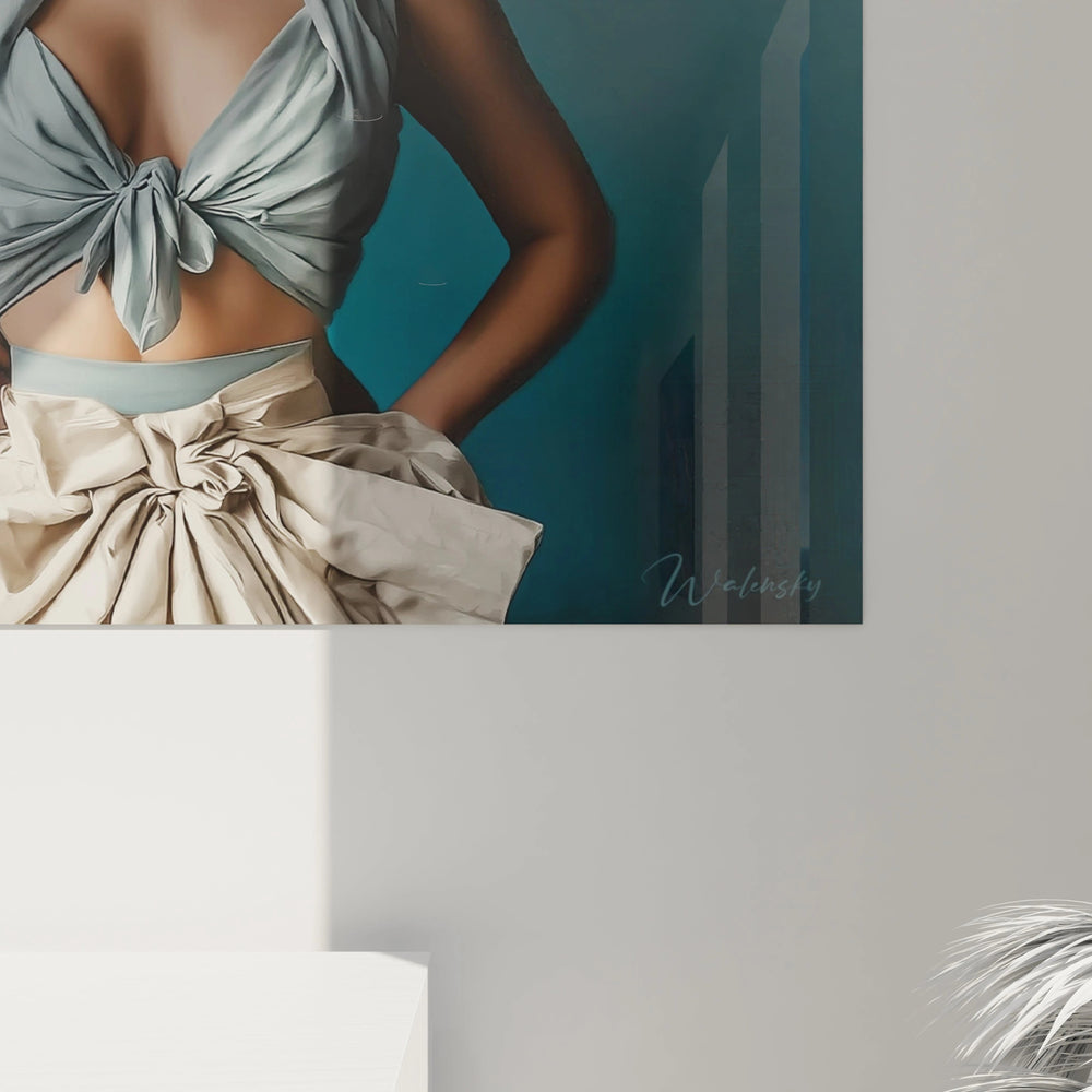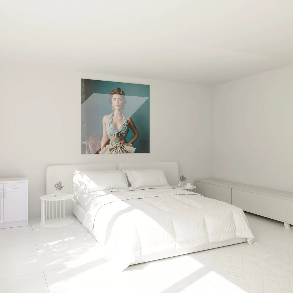 Cette œuvre s'inscrit dans la lignée des portraits glamour hollywoodiens, rappelant les photographies iconiques de George Hurrell ou les illustrations pin-up de Gil Elvgren. On retrouve également l'influence du mouvement Art Déco dans la composition géométrique et les lignes épurées. L'esthétique rappelle les œuvres de Tamara de Lempicka pour son côté sophistiqué et moderne, tout en conservant la sensualité classique des portraits de John Singer Sargent. Cette fusion d'influences crée une œuvre contemporaine vintage aux références intemporelles parfaite pour les amateurs d'art mural féminin.