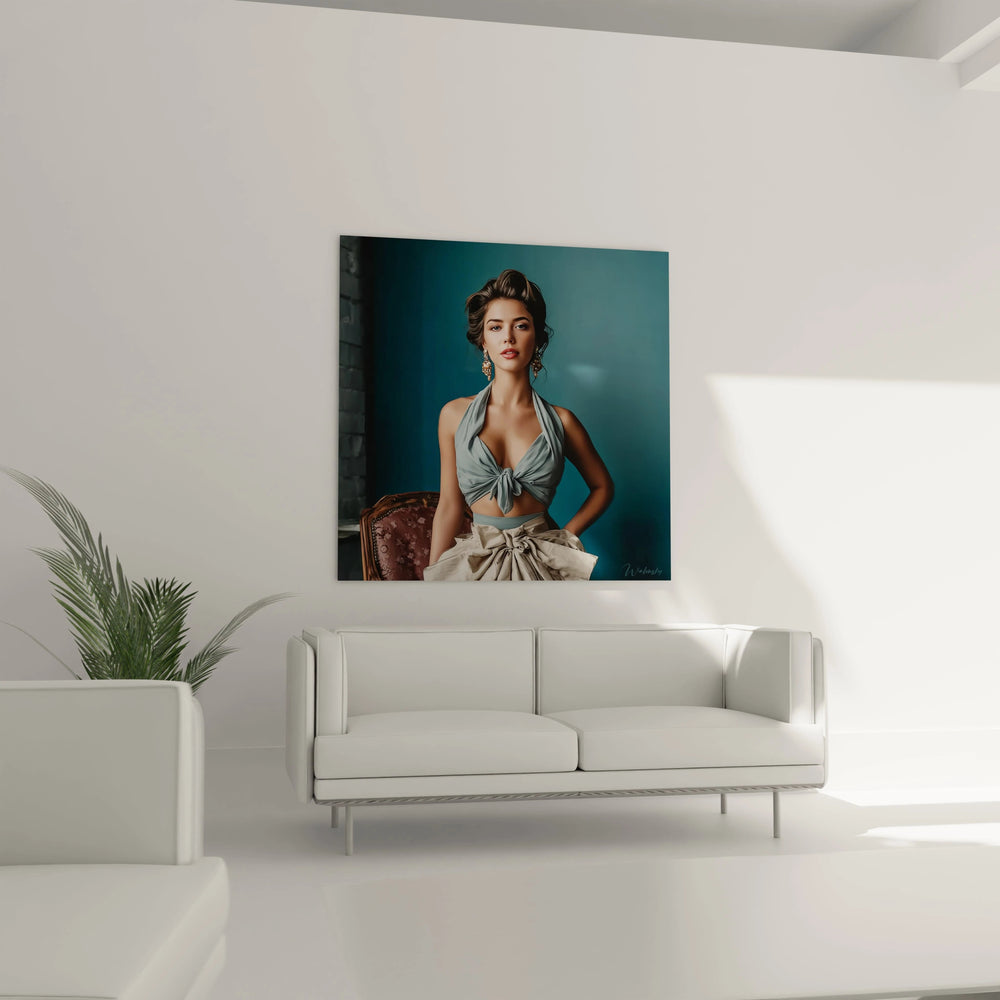 Ce tableau mural beauté féminine capture l'essence de la beauté féminine classique à travers un portrait saisissant d'une femme élégante dans un style rétro sophistiqué. L'œuvre présente une jeune femme aux traits délicats, coiffée dans le style iconique des années 1950 avec ses cheveux bruns ondulés parfaitement arrangés en volume. Son regard captivant, souligné par un maquillage impeccable aux lèvres rouge corail, évoque la grâce des stars hollywoodiennes de l'âge d'or du cinéma. La tenue vestimentaire, composée d'un haut gris sage noué au décolleté et d'une jupe beige ornée d'un nœud décoratif, reflète l'élégance raffinée de l'époque. Les boucles d'oreilles dorées ajoutent une touche de luxe qui complète harmonieusement cette composition. Le fauteuil fleuri vintage sur lequel elle pose renforce l'atmosphère nostalgique, tandis que le fond turquoise profond crée un contraste saisissant qui met en valeur la beauté du sujet. L'éclairage dramatique et la qualité artistique de ce portrait vintage féminin en font une pièce décorative exceptionnelle qui transformera n'importe quel espace en galerie d'art personnelle. Cette décoration murale élégante s'intègre parfaitement dans les intérieurs modernes ou classiques.