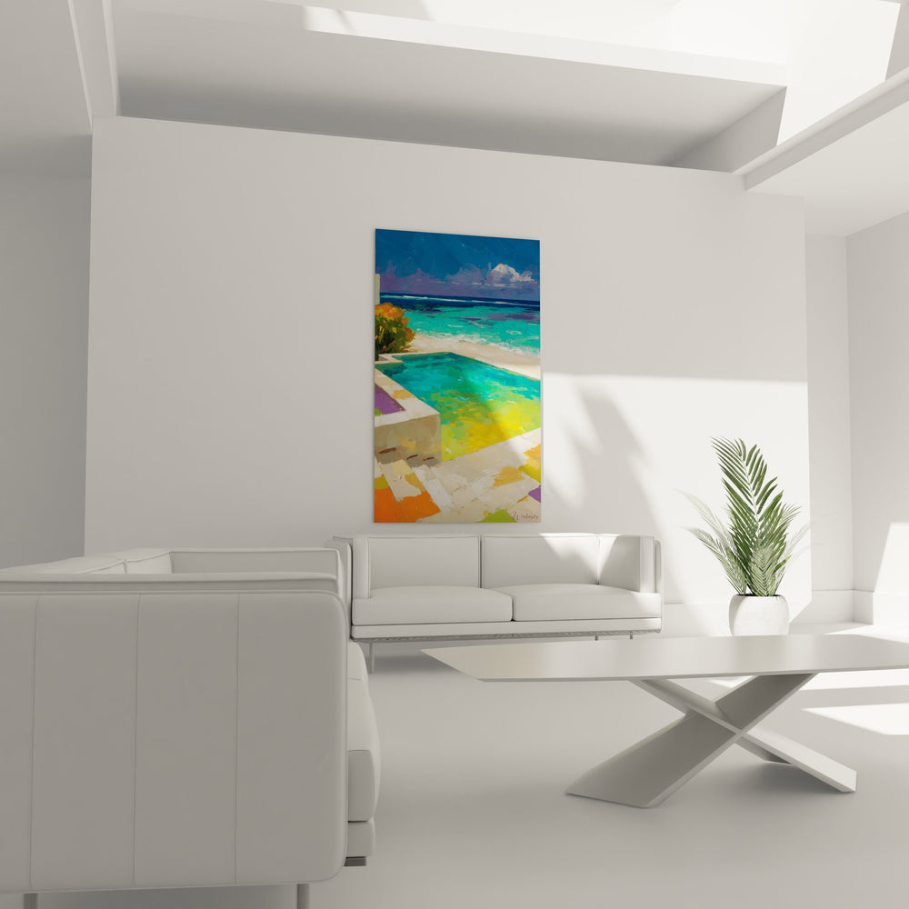 Ce tableau mural piscine tropicale capture avec une intensité saisissante l'essence même du paradis aquatique. L'œuvre dépeint une piscine à débordement aux eaux cristallines qui se fondent harmonieusement avec l'océan turquoise en arrière-plan. Les tons vibrants de bleu azur et de turquoise dominent la composition, créant une sensation d'immersion totale dans un paysage tropical idyllique. La technique picturale révèle des touches expressives qui donnent vie à chaque reflet aquatique, tandis que la végétation luxuriante sur la gauche apporte des accents colorés d'orange et de vert. Ce tableau décoratif mer turquoise transforme instantanément l'atmosphère d'un intérieur en évoquant les îles paradisiaques et leurs lagons enchanteurs. La perspective choisie par l'artiste place le spectateur au bord de cette piscine de luxe, créant une invitation irrésistible à l'évasion. Les nuages cotonneux qui ponctuent le ciel azur ajoutent une dimension poétique à cette scène aquatique tropicale, rappelant les après-midi ensoleillés des destinations de rêve.