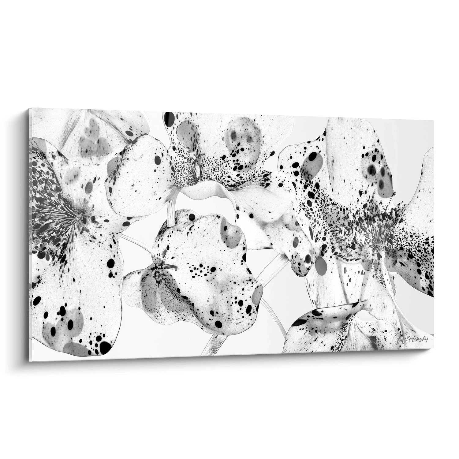 Ce tableau lys tachetés présente une composition florale saisissante où la pureté des fleurs rencontre l'expression artistique contemporaine. L'œuvre capture des lys dans leur splendeur naturelle, magnifiés par des projections d'encre noire qui créent un contraste dramatique. Cette décoration murale lys artistique se distingue par son approche unique du motif floral, transformant des éléments botaniques classiques en art moderne expressif. Les pétales délicatement dessinés contrastent avec les éclaboussures spontanées, créant une tension visuelle captivante qui interpelle immédiatement le regard.