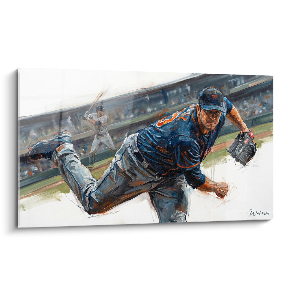Cette œuvre d'art captivante immortalise l'intensité du baseball à travers une scène d'action saisissante. Au premier plan, un lanceur expérimenté, vêtu de l'uniforme bleu et orange emblématique, effectue un mouvement de lancer avec une précision remarquable. Son expression concentrée et déterminée reflète la passion et l'engagement total du sportif professionnel. En arrière-plan, la silhouette d'un batteur en position d'attente ajoute une dimension stratégique à la composition. Le stade rempli de spectateurs crée une atmosphère électrisante, rappelant l'émotion des grandes rencontres de baseball. La technique picturale employée mélange réalisme et expressionnisme, avec des coups de pinceau énergiques qui renforcent le dynamisme de l'action sportive. Cette représentation artistique du baseball capture parfaitement l'essence de ce sport américain légendaire, entre technique, stratégie et spectacle grandiose.