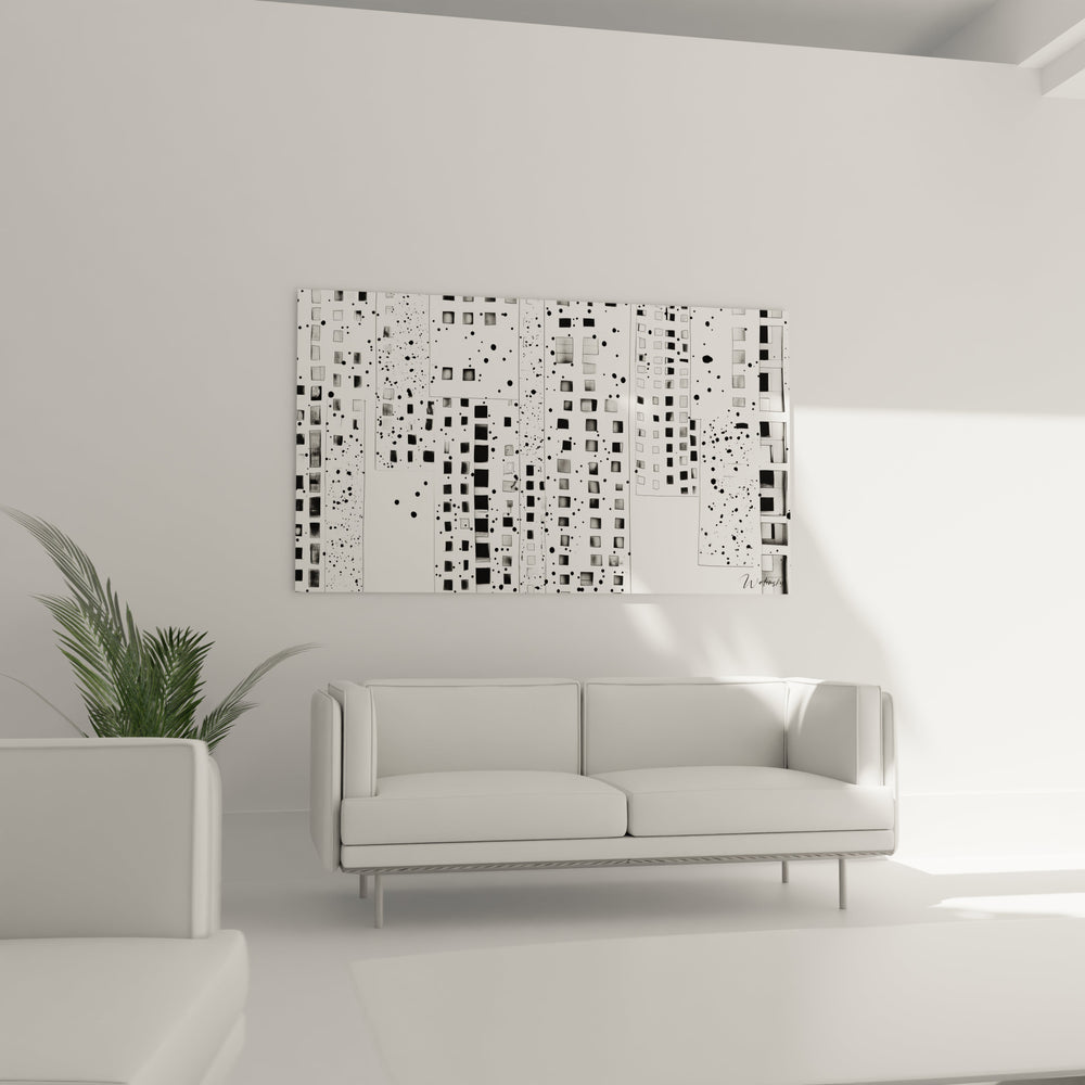 À distance, cette décoration murale géométrique minimaliste impose sa présence par son unité graphique forte et son équilibre monumental. L'ensemble révèle alors sa structure architecturale, évoquant une façade urbaine stylisée ou une partition visuelle complexe. L'approche progressive dévoile progressivement la richesse des détails : variations de tailles, jeux d'alignements, contrastes de densité qui enrichissent continuellement la lecture de l'œuvre. Cette tableau géométrique noir blanc architectural offre ainsi une expérience évolutive où chaque distance d'observation révèle de nouveaux aspects, démontrant la maîtrise compositionnelle de l'artiste dans la création d'une œuvre à la fois simple et complexe, accessible et sophistiquée.