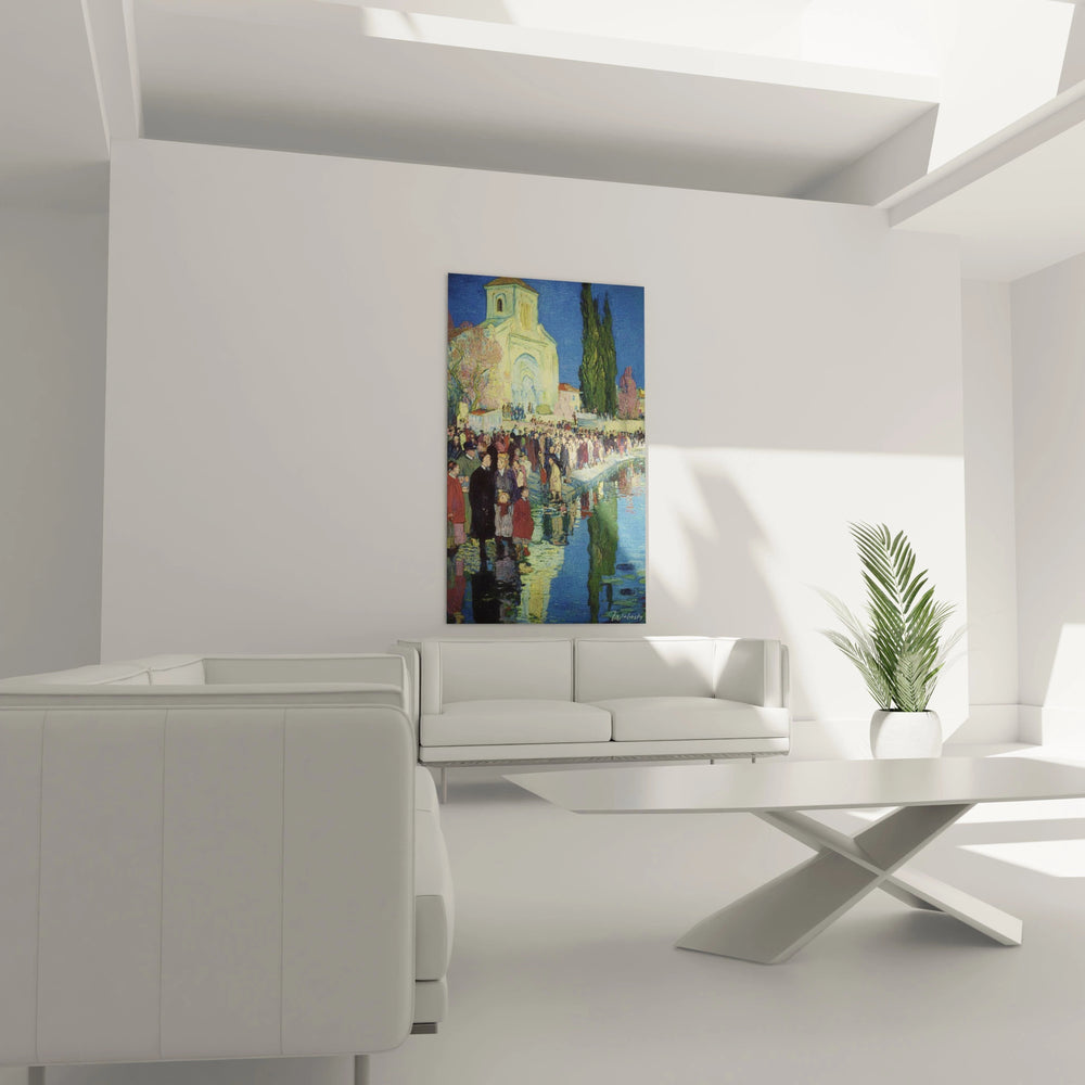 Ce tableau place de village capture une scène communautaire fascinante où une foule colorée se rassemble dans un cadre architectural remarquable. L'œuvre présente une composition vibrante dominée par une imposante tour claire qui s'élève majestueusement contre un ciel bleu profond. Les personnages nombreux, représentés dans diverses tenues traditionnelles, créent un mouvement dynamique sur une surface pavée aux reflets chatoyants. Cette décoration murale place de village dégage une atmosphère à la fois solennelle et vivante, typique des rassemblements populaires. La technique post-impressionniste se manifeste par des touches de couleur expressives et des contrastes lumineux qui donnent vie à cette scène sociale captivante.