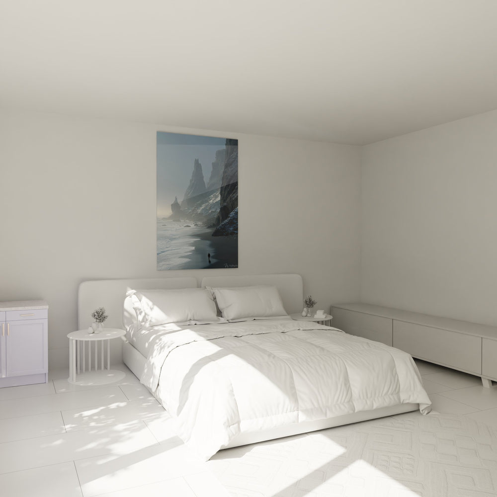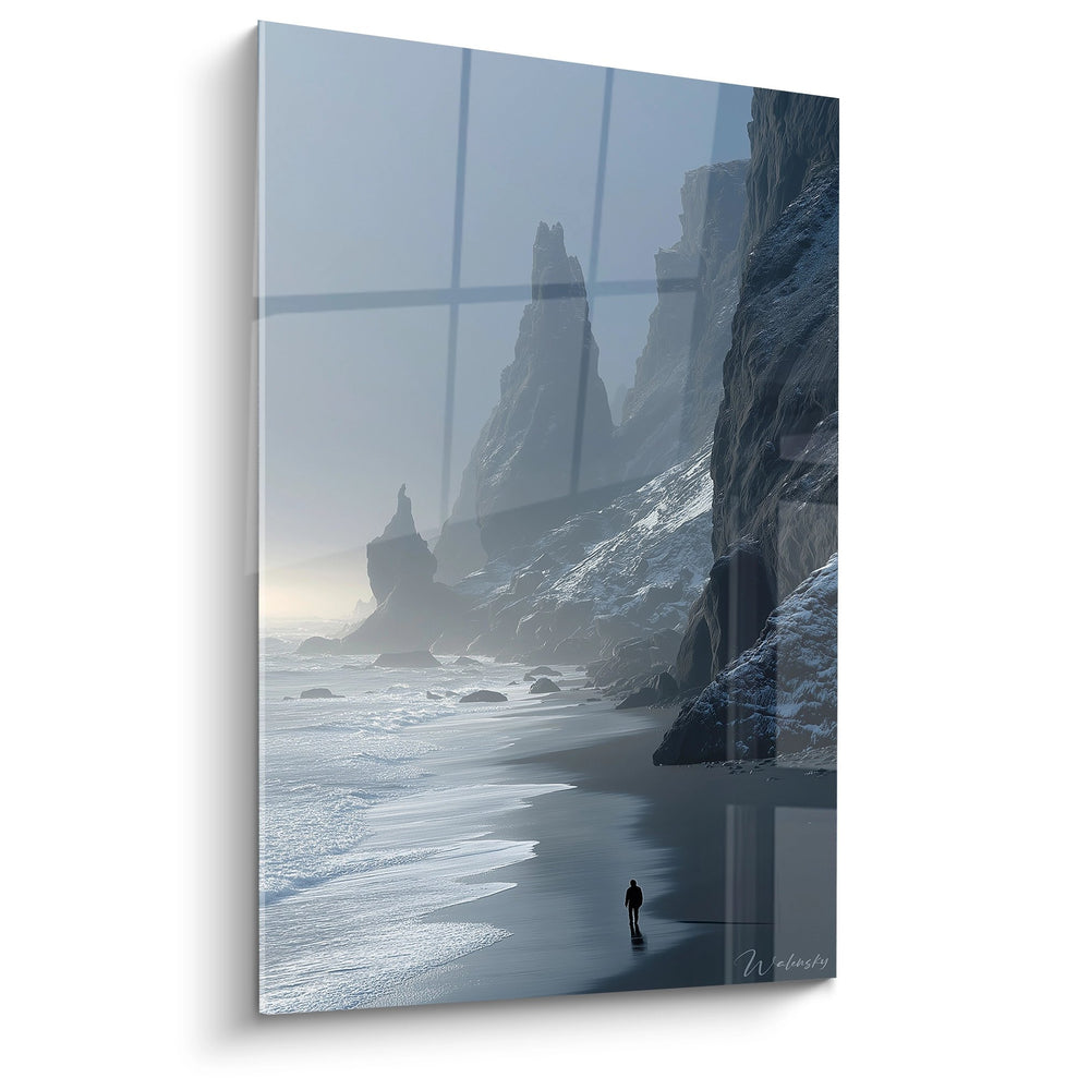 Ce tableau mural plage côte sauvage capture avec une intensité saisissante la beauté dramatique d'un littoral rocheux baigné dans une lumière crépusculaire. L'œuvre révèle une plage de sable noir s'étendant au pied de falaises imposantes, où les formations rocheuses se dressent comme des sentinelles sculptées par l'érosion marine. Au premier plan, une silhouette humaine solitaire se détache sur le sable mouillé, créant un contraste poétique entre la grandeur de la nature et la petitesse de l'homme. Cette décoration murale plage exprime parfaitement l'atmosphère mystérieuse des côtes nordiques, où la mer rencontre la terre dans un ballet éternel. Les vagues viennent lécher doucement le rivage tandis que la brume enveloppe les sommets rocheux d'un voile mystérieux. L'artiste a su saisir ce moment suspendu où la nature révèle sa puissance tranquille, transformant cette toile paysage marin en une invitation à la contemplation. Les reflets sur le sable humide créent une perspective profonde qui guide l'œil vers l'horizon lointain, renforçant l'impression d'immensité et de sérénité qui émane de cette œuvre d'art côte rocheuse.
