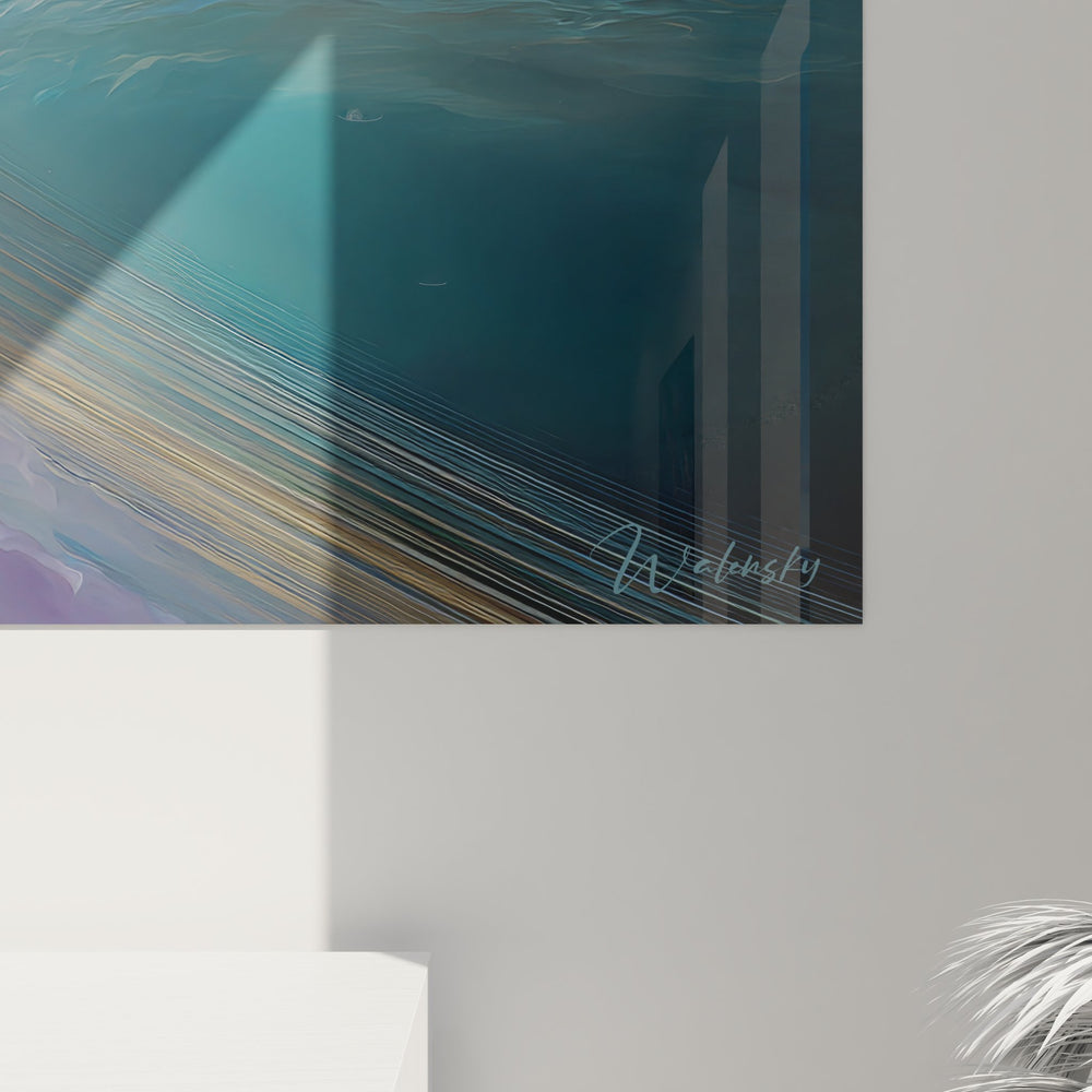 La palette chromatique de ce tableau planète saturne évoque la sérénité cosmique et l'infini mystérieux. Les tons bleu-turquoise de la planète symbolisent la sagesse et la contemplation, tandis que les anneaux dorés représentent l'harmonie céleste et l'équilibre universel. Les nuages violets et roses suggèrent la magie de l'exploration spatiale et l'émerveillement face aux mystères de l'univers.