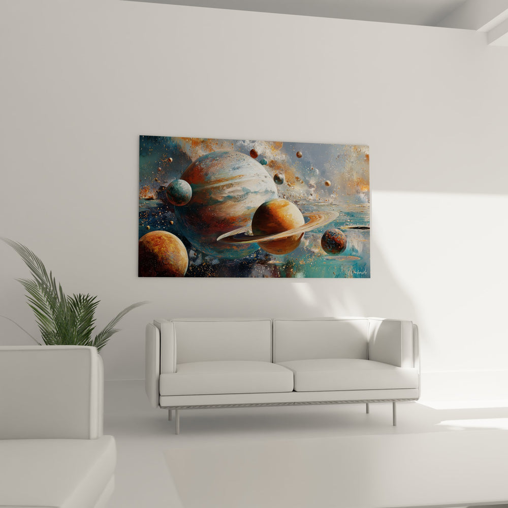 Ce tableau mural planètes système solaire offre une vision spectaculaire de l'univers avec ses corps célestes aux couleurs chatoyantes. L'œuvre présente plusieurs planètes cosmiques de tailles variées, flottant majestueusement dans un espace parsemé d'étoiles et de poussière cosmique. Au centre de la composition, une imposante planète aux teintes bleu-gris domine la scène, entourée de satellites plus petits qui gravitent dans son orbite. Ce tableau espace artistique capture parfaitement l'immensité et la beauté du cosmos avec ses nuances subtiles allant des tons orangés chaleureux aux bleus profonds de l'espace intersidéral. Les détails minutieux révèlent des surfaces planétaires texturées, certaines dotées d'anneaux caractéristiques qui rappellent Saturne. La décoration murale astronomique s'enrichit de particules lumineuses et d'effets de matière qui créent une atmosphère dynamique et mystérieuse. L'artiste a su maîtriser les jeux d'ombres et de lumières pour donner une profondeur saisissante à cette représentation spatiale moderne, où chaque élément semble flotter en apesanteur dans cet univers fantastique aux couleurs cosmiques éclatantes.