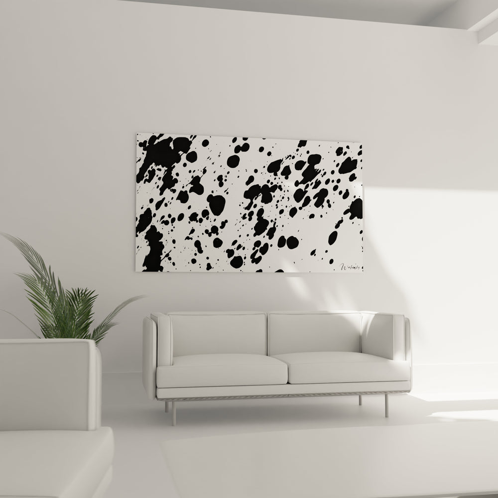 Ce tableau éclaboussures noir et blanc présente une composition abstraite saisissante dominée par des projections d'encre noire sur fond immaculé. L'œuvre révèle un univers de taches organiques de tailles variées, allant de minuscules points à de larges formes irrégulières qui s'éparpillent librement sur la surface. Cette décoration murale éclaboussures contemporaine capture l'essence même du mouvement figé, où chaque goutte semble suspendue dans un ballet chorégraphié par le hasard contrôlé.