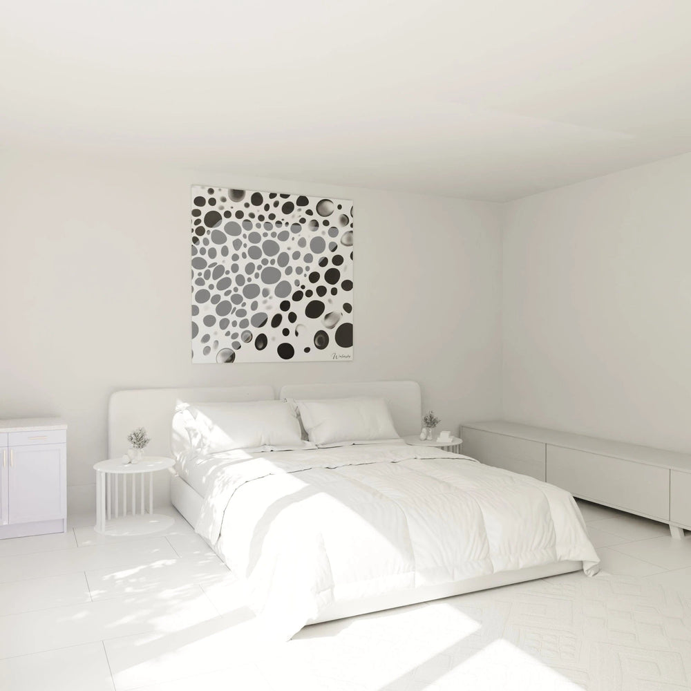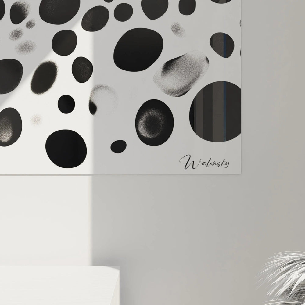 Cette harmonie monochrome génère une atmosphère à la fois contemplative et dynamique, parfaite pour une décoration murale tacheté contemporaine qui s'intègre facilement dans des intérieurs modernes.