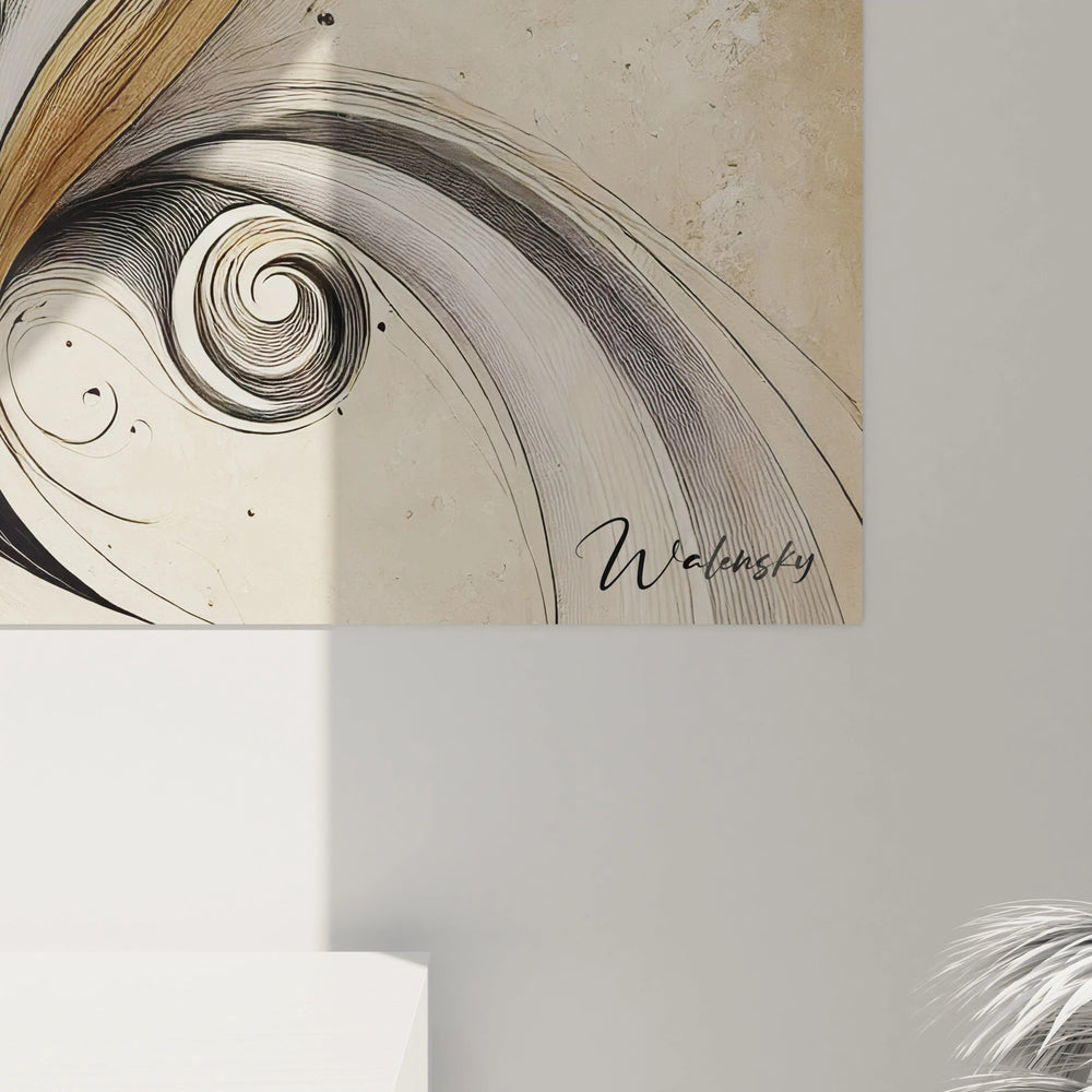 Cette œuvre unique capture l’essence d’un univers glacial et vibrant de vie. Le manchot, silhouette profonde et noble en noir intense, se détache sur un fond délicatement travaillé de spirales beiges, évoquant les courants invisibles et mystérieux qui sculptent son habitat naturel. Des touches d’orange subtilement placées autour de la tête apportent une chaleur délicate, un souffle de vie au sein d’un décor raffiné. Chaque regard posé sur ce tableau vous plonge dans l’ambiance douce et apaisante d’un paysage polaire enveloppé de calme.