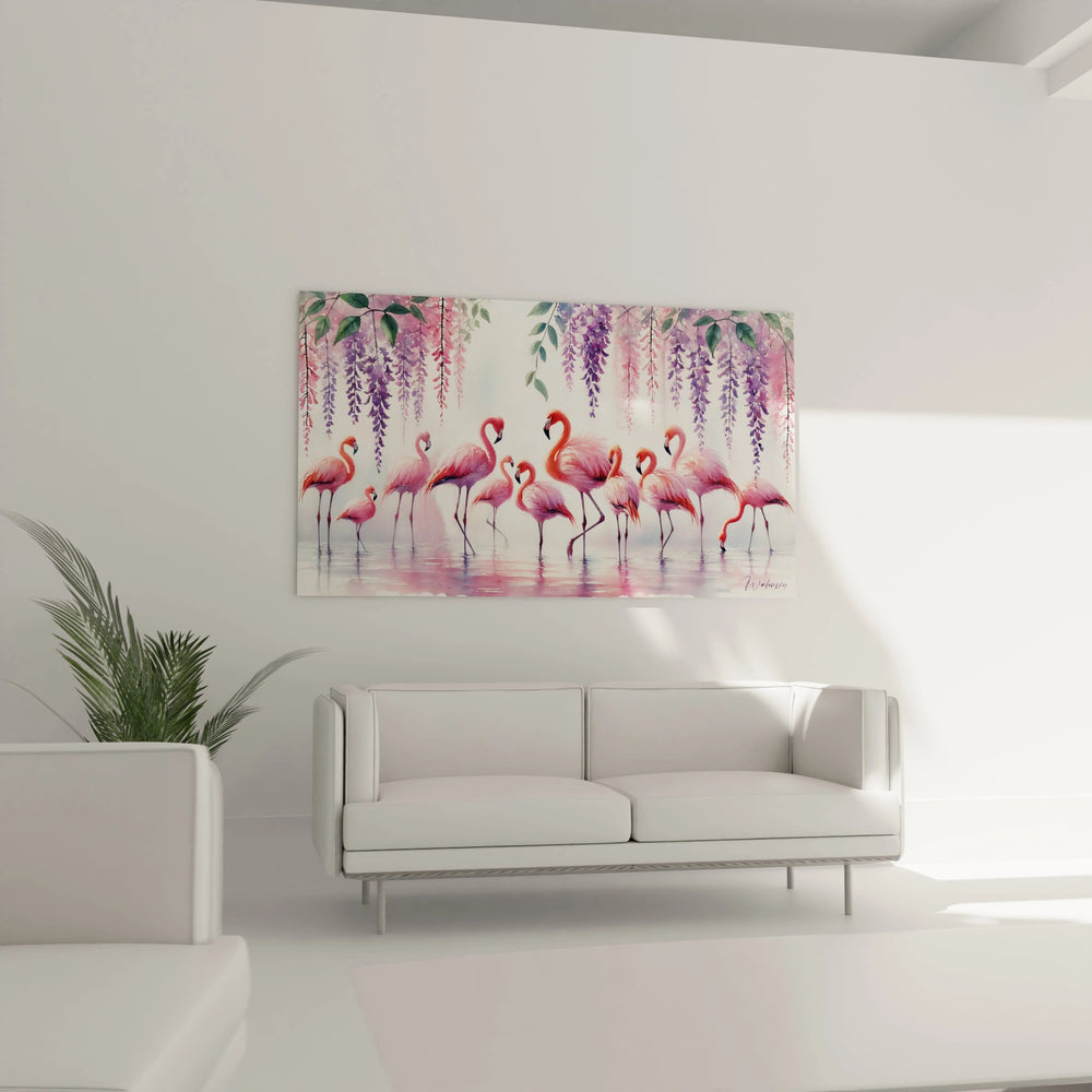 Chaque flamant rose représenté semble évoluer avec grâce, comme figé dans une chorégraphie naturelle, douce et fluide. Autour d’eux, des fleurs suspendues flottent dans une ambiance presque onirique, créant un halo de fraîcheur et de poésie. Vous ressentirez cette légèreté suspendue, ce souffle d’air délicat, qui transforme votre pièce en un véritable havre de paix. En contemplant ce tableau, vous voilà transporté dans un monde où la nature s’exprime en silence mais avec force, apaisant vos sens dès le premier regard.