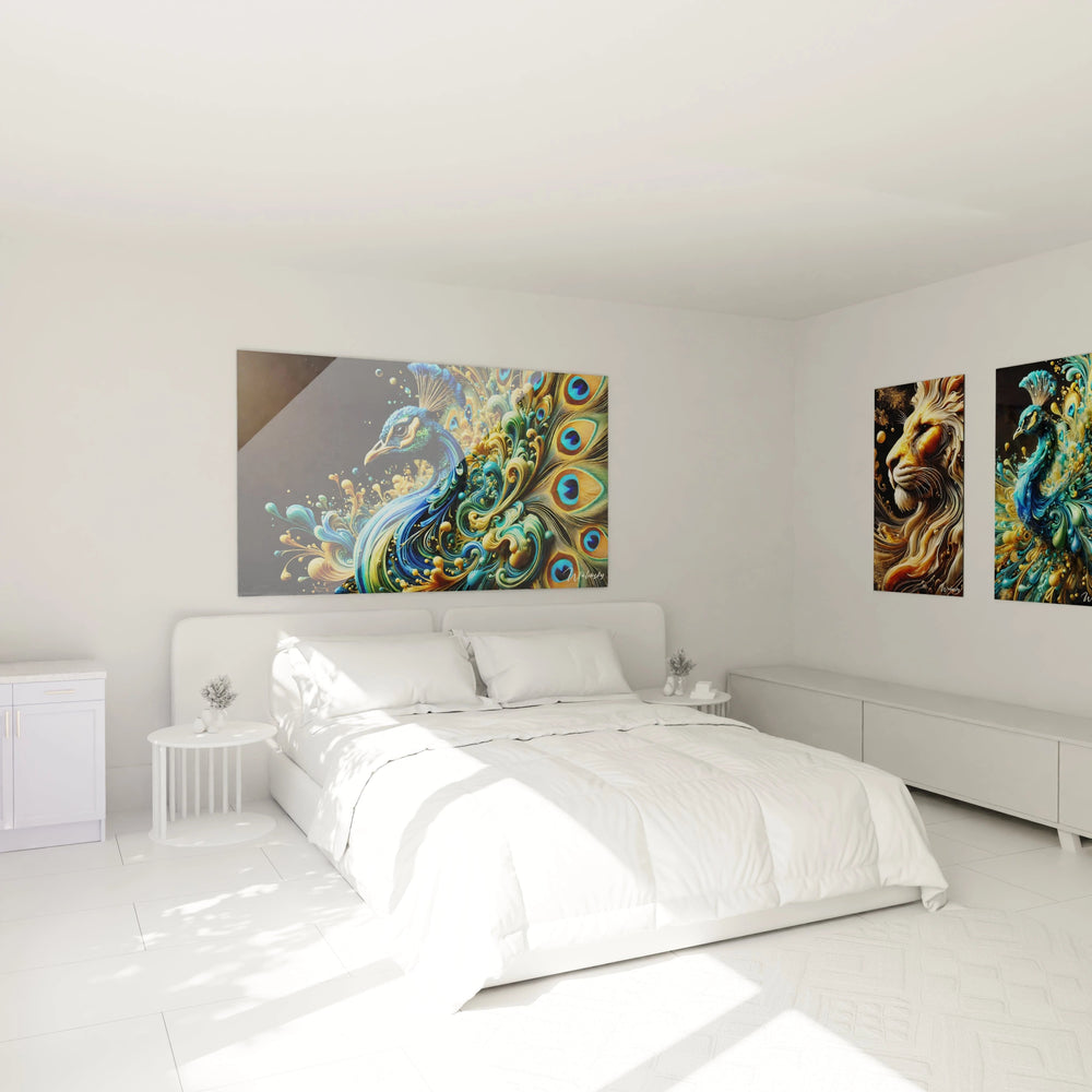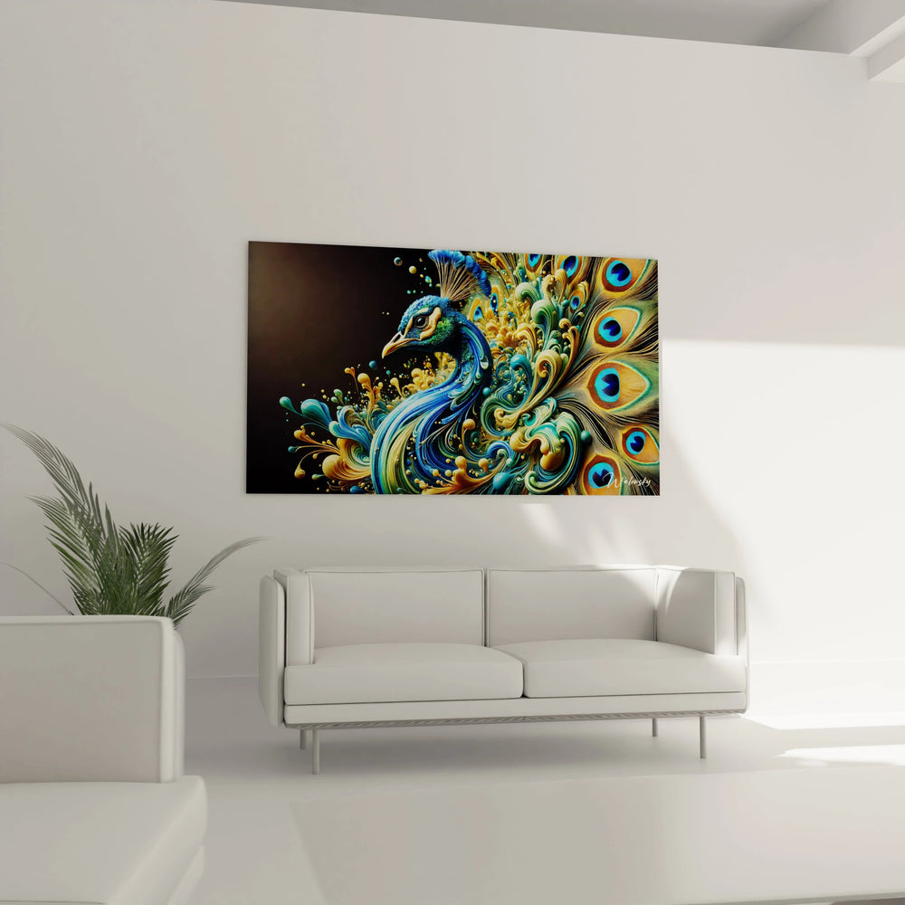 Conçu comme un hommage vibrant à la majesté du paon, ce tableau capture l’instant où les plumes se déploient en une danse hypnotique. Chaque détail est travaillé avec une subtilité fascinante : les spirales abstraites mêlées à un réalisme délicat offrent un mouvement fluide qui semble animer la toile. Imaginez l'éclat bleu profond, les reflets verts lumineux et les touches dorées, qui s’illuminent sous la lumière pour faire vibrer votre pièce d’une énergie singulière.