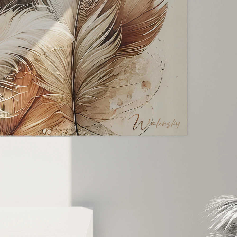 Visualisez la texture douce et presque palpable des plumes, la sensation soyeuse qu’elles évoquent, comme une caresse visuelle venant réchauffer votre âme. Cette composition unique fait bien plus qu’habiller un mur : elle transforme votre pièce en un havre de paix, une bulle où le calme invite à la méditation et à l’équilibre intérieur.