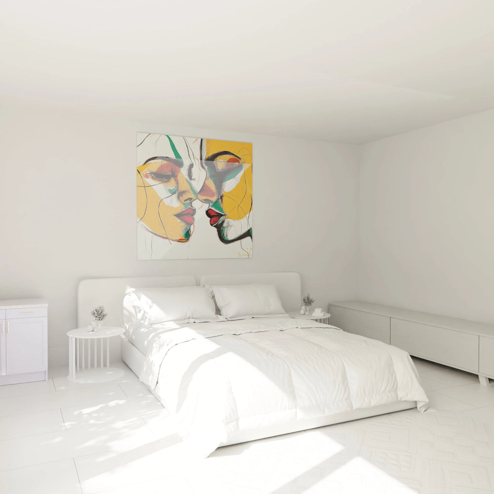 L'unicité de ce tableau visage abstrait expressif réside dans sa capacité à capturer l'essence de l'intimité humaine à travers une simplification audacieuse des formes. La proximité des deux visages, presque sur le point de s'embrasser, crée une narration immédiatement identifiable malgré l'abstraction. Cette tension narrative, renforcée par la vibration des couleurs et l'énergie des traits, distingue cette décoration murale abstraite des représentations plus conventionnelles.