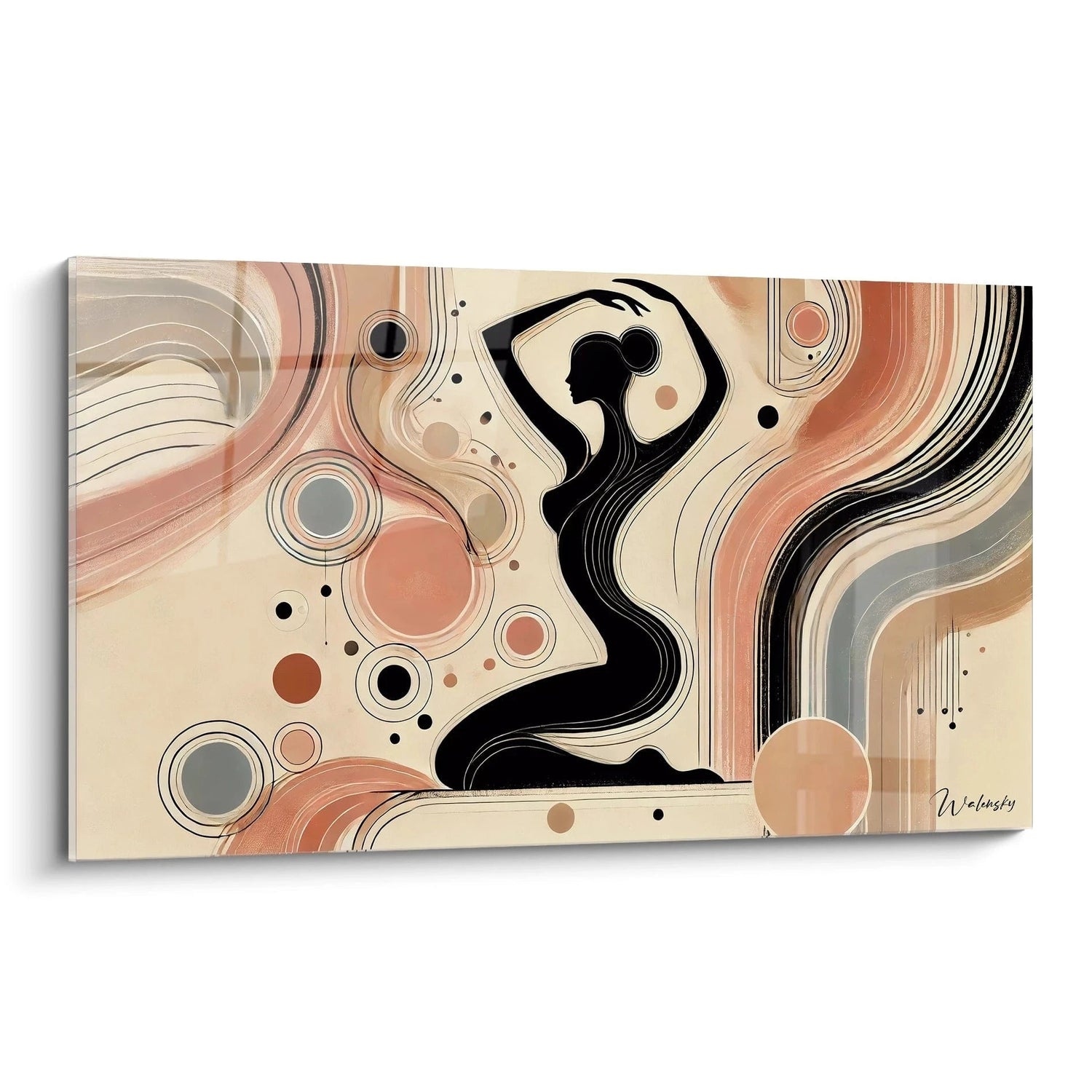 Imaginez une silhouette noire profonde qui s’élève avec élégance, entourée de formes organiques aux teintes beige et rose, délicatement contrastées pour créer une atmosphère chaleureuse et raffinée. Ce tableau transcende la simple décoration : il raconte une histoire, celle d’un corps en liberté, suspendu dans une danse où chaque courbe invite à la contemplation et à l’émerveillement.