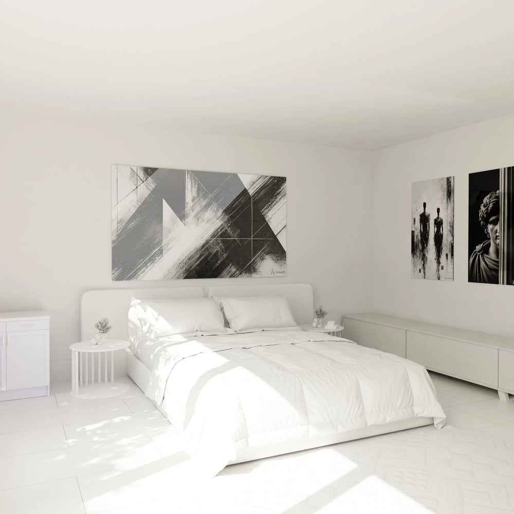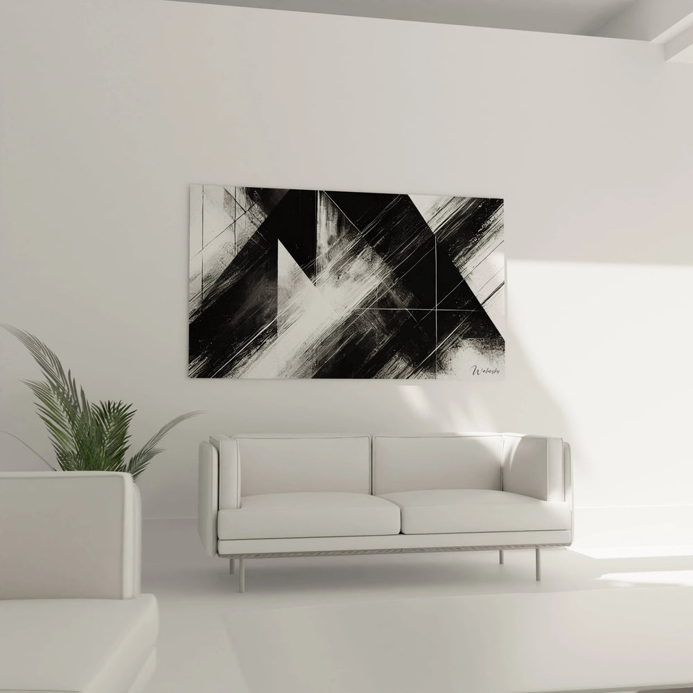 La palette de ce tableau se déploie entre le noir profond, le blanc éclatant et des nuances subtiles de gris, conférant à l’œuvre une élégance intemporelle. Cette sobriété chromatique concentre toute l’attention sur la dynamique des lignes et des formes, apportant ainsi une dimension presque sculpturale à votre mur.
