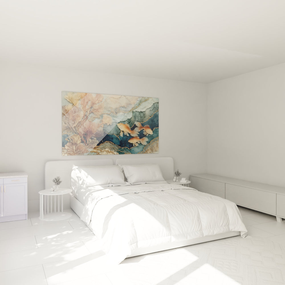 La palette chromatique marine de cette œuvre évoque la paix intérieure et l'harmonie avec la nature. Les tons dorés des poissons symbolisent la prospérité et la vitalité, tandis que les nuances coral et turquoise rappellent la richesse de la biodiversité marine. Cette composition artistique crée une atmosphère apaisante parfaite pour les espaces de détente et de méditation.