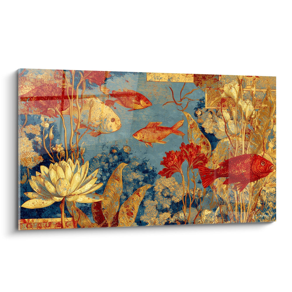 Chaque détail de ce tableau est pensé pour créer un équilibre visuel élégant, tout en apportant une note de mystère et d'évasion. Les poissons dorés, symbole de prospérité et de bonne fortune, brillent, transformant votre pièce en un sanctuaire de paix.