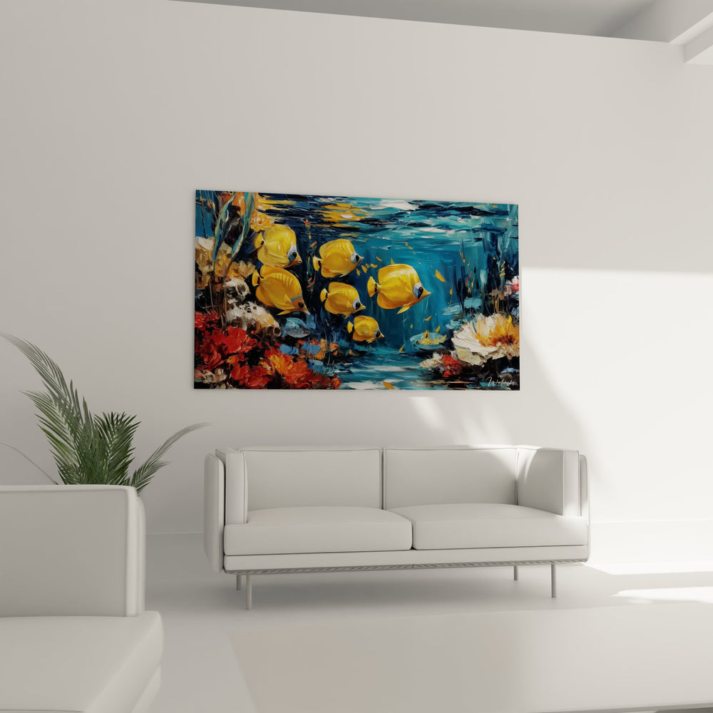 Ce magnifique tableau mural poissons tropicaux nous transporte au cœur d'un récif corallien vibrant où évoluent gracieusement six poissons jaunes d'une beauté saisissante. L'artiste a su capturer avec une technique impressionniste remarquable l'essence même de la vie marine tropicale, créant une œuvre d'art aquatique d'une intensité visuelle exceptionnelle. Les poissons jaunes coralliens semblent danser dans les eaux cristallines, leurs corps arrondis et leurs nageoires délicates rendus avec un réalisme touchant. Le tableau fonds marins coloré révèle un écosystème sous-marin luxuriant où les coraux rouges et oranges contrastent magnifiquement avec les nuances azurées de l'eau. Cette peinture aquatique tropicale transforme instantanément votre espace en créant une fenêtre sur l'univers fascinant des profondeurs océaniques. Les jeux de lumière sous-marine, magistralement retranscrits par des touches de pinceau expertes, donnent une impression de mouvement perpétuel et de vie authentique à cette décoration murale marine d'exception.