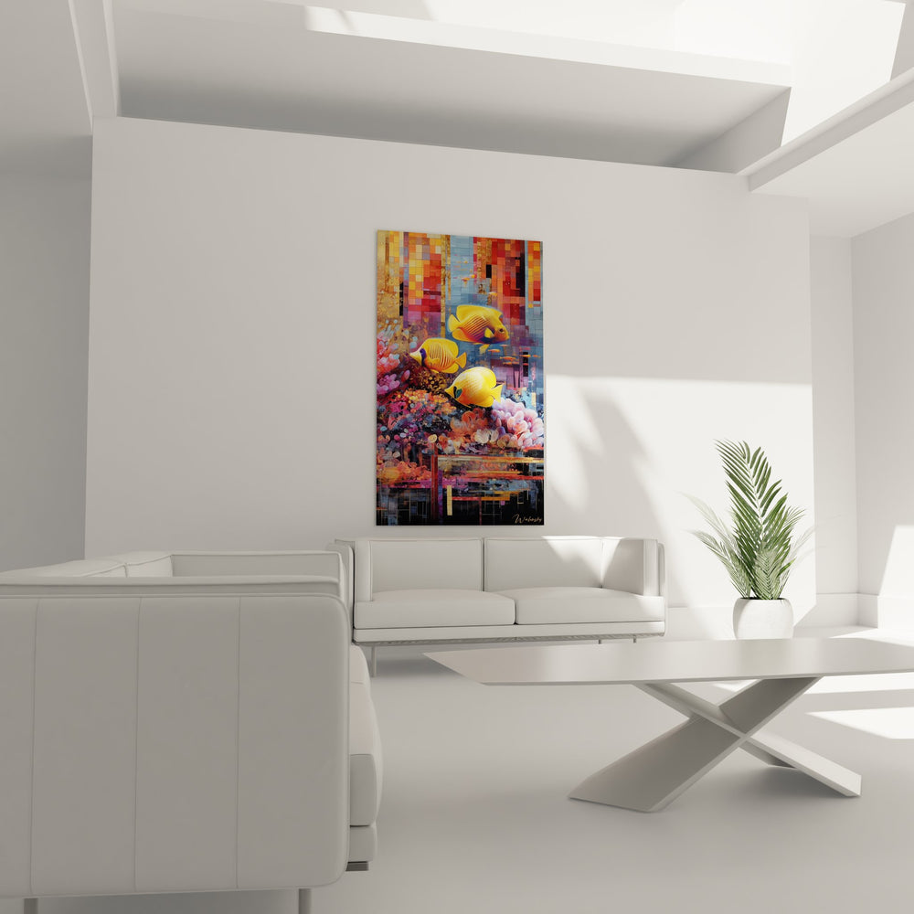 Ce magnifique tableau mural poissons tropicaux présente une scène sous-marine d'une beauté saisissante, mettant en vedette trois poissons-papillons jaunes évoluant gracieusement au-dessus d'un récif corallien multicolore. L'artiste a créé une composition harmonieuse où la vie marine tropicale s'épanouit dans un environnement aquatique luxuriant. Les poissons, aux teintes dorées éclatantes avec leurs nageoires délicatement striées, semblent danser au milieu des coraux roses, violets et oranges qui tapissent le fond océanique. Cette œuvre d'art fonds marins combine habilement réalisme photographique et stylisation artistique, créant une atmosphère onirique renforcée par un traitement pixellisé en arrière-plan. La technique mixte utilisée intègre des éléments abstraits géométriques qui se fondent harmonieusement avec la représentation naturaliste de la faune aquatique colorée. Les coraux branchus et massifs créent un paysage sous-marin dense et vibrant, offrant un habitat naturel authentique à ces créatures marines. Cette décoration murale aquatique transforme instantanément n'importe quel espace en fenêtre ouverte sur les merveilles des océans tropicaux, apportant sérénité et émerveillement.