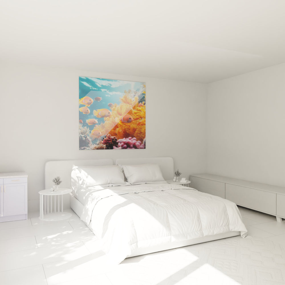 La palette chromatique orange et bleu de ce tableau évoque la dualité entre la chaleur des coraux et la fraîcheur des profondeurs marines. L'orange dominant symbolise la vitalité et l'énergie de la vie marine, tandis que les tons roses des poissons apportent une douceur contemplative. Cette harmonie colorée aquatique crée une atmosphère apaisante qui transforme l'espace en véritable havre de paix.