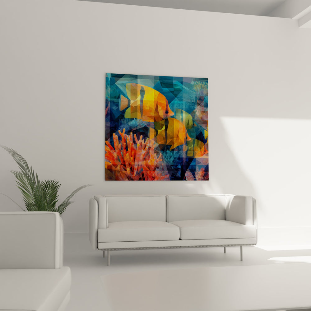Tags : poissons tropicaux, art géométrique, décoration marine, tableau coloré, art moderne