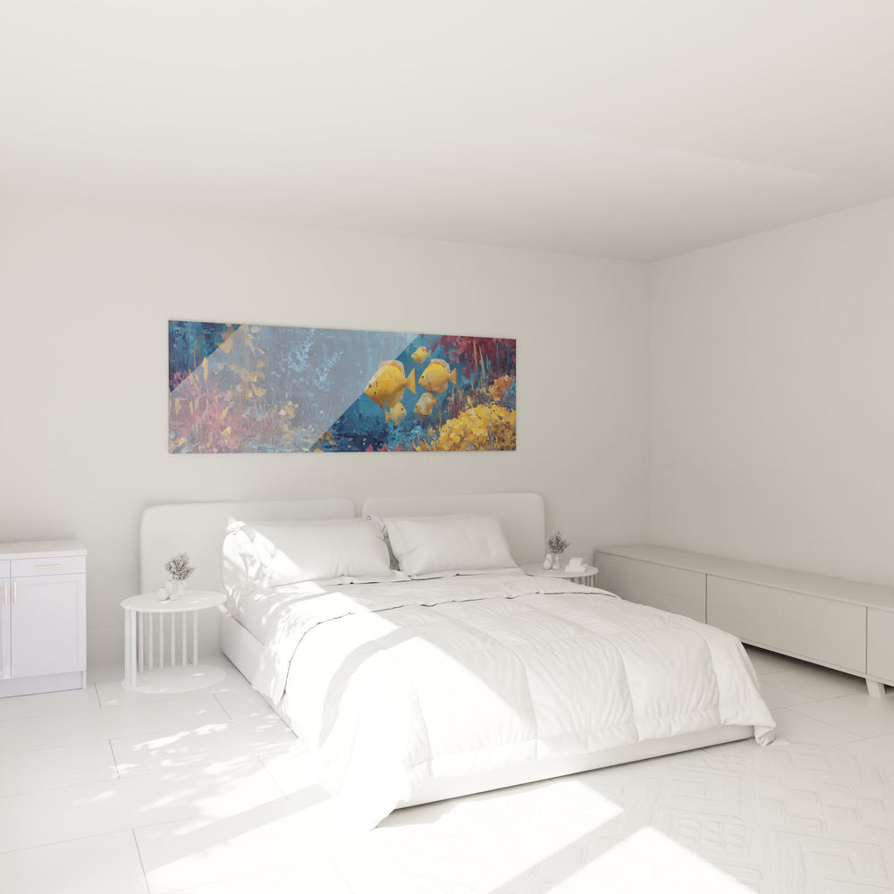Ce tableau mural poissons tropicaux offre une vision enchanteresse d'un récif corallien vibrant de vie. L'œuvre met en scène un banc de poissons jaunes évoluant gracieusement dans les eaux cristallines d'un environnement sous-marin préservé. La peinture fonds marins révèle une biodiversité exceptionnelle où les coraux colorés se déploient dans un kaléidoscope de teintes pourpres, roses et orangées. Les poissons tropicaux aux reflets dorés semblent danser entre les formations coralliennes, créant un mouvement naturel qui captive le regard. Cette décoration marine sophistiquée transforme instantanément l'atmosphère d'une pièce en évoquant la sérénité des profondeurs océaniques. La technique picturale employée sublime les textures des coraux et la fluidité de l'eau, offrant un rendu d'une précision remarquable. Chaque détail de cette art aquatique témoigne d'une maîtrise artistique exceptionnelle, des nuances subtiles des écailles aux jeux de lumière filtrant à travers l'eau turquoise.