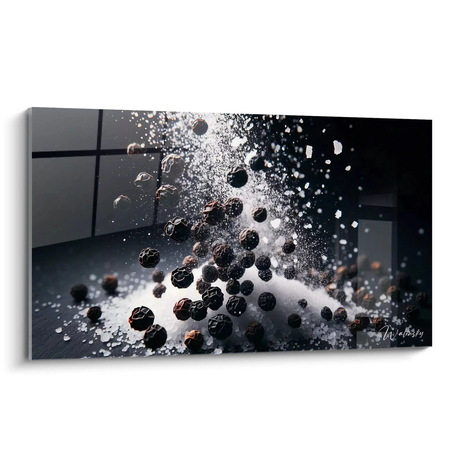 Imaginez un instant figé dans le temps, où le poivre noir virevolte avec énergie, tandis que le sel scintille comme autant de petites étoiles éclatantes, suspendus dans une danse légère et passionnée. Ce tableau vous invite à ressentir cette magie invisible qui transforme chaque plat en une expérience sensorielle unique, un hommage élégant à ces ingrédients fondamentaux de nos cuisines.