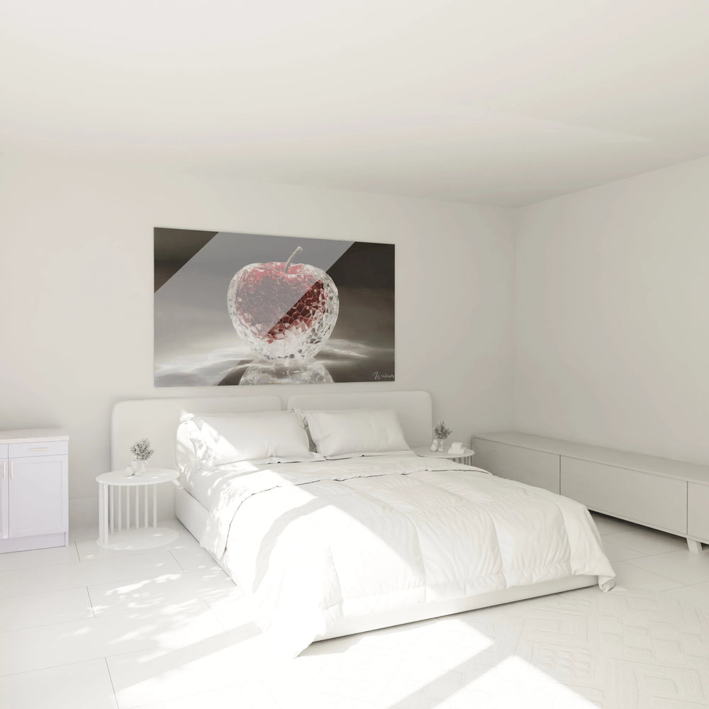Imaginez une pomme figée dans le temps, à moitié cristallisée, comme si elle révélait son essence intime sous un éclat translucide. Cette représentation hyperréaliste réinvente l'objet du quotidien avec une touche de surréalisme, conjuguant la douceur organique du fruit à la froide élégance du cristal. Le rouge profond vibrant se mêle aux reflets argentés et aux nuances blanches lumineuses, créant un contraste saisissant qui attire immédiatement le regard.