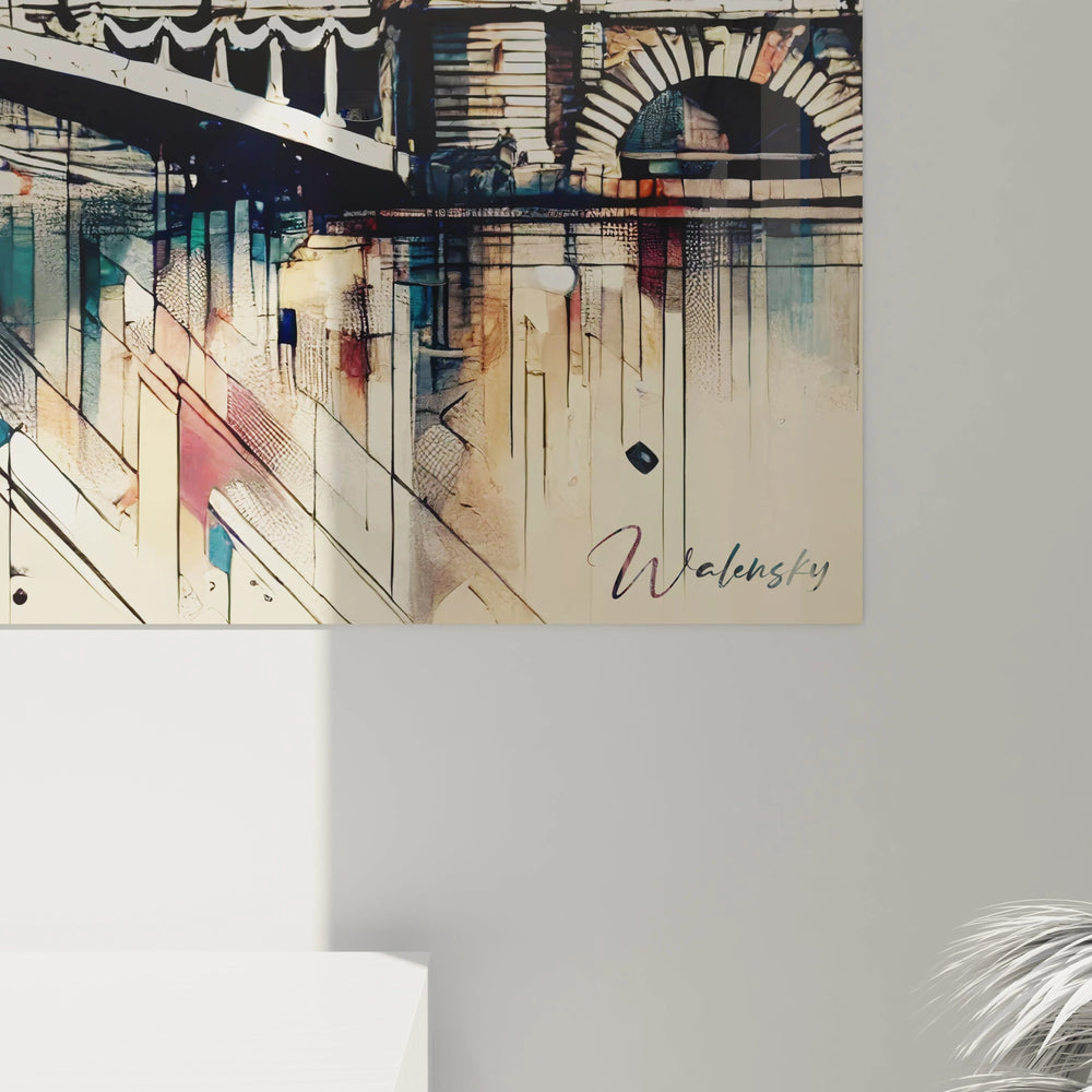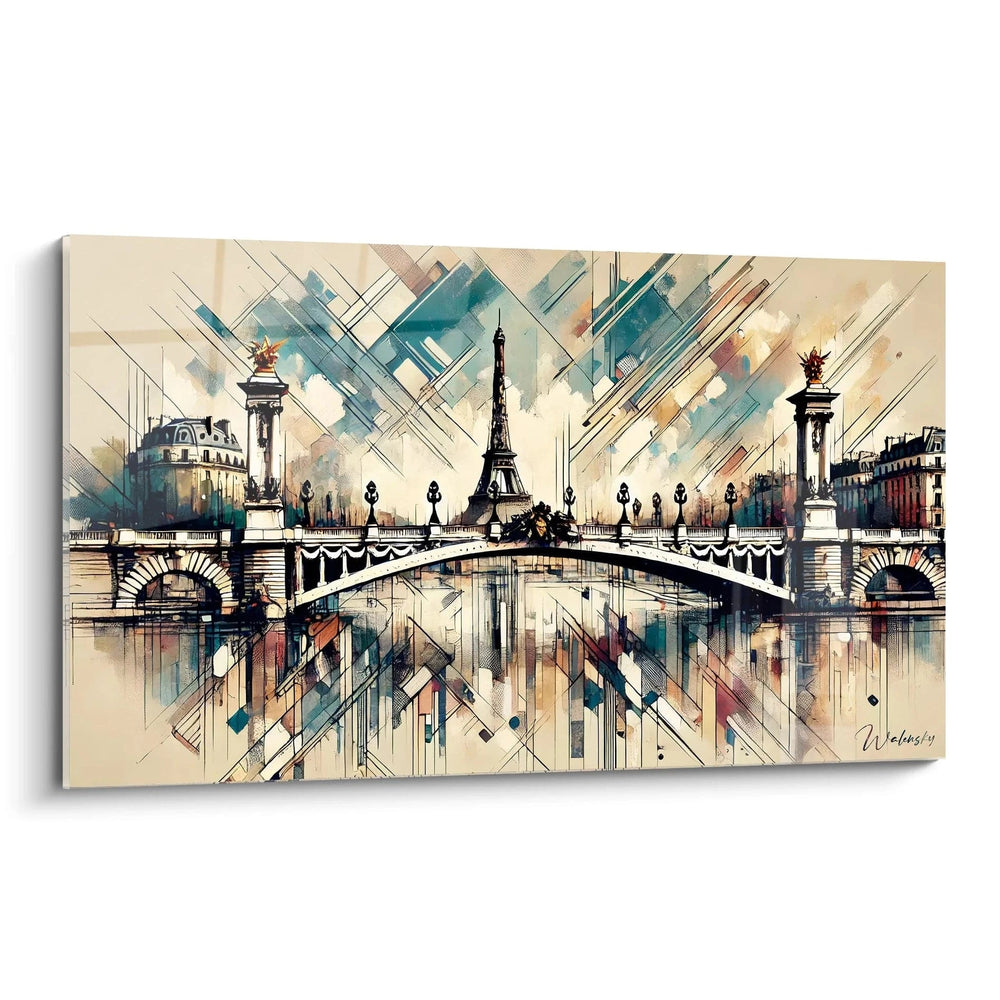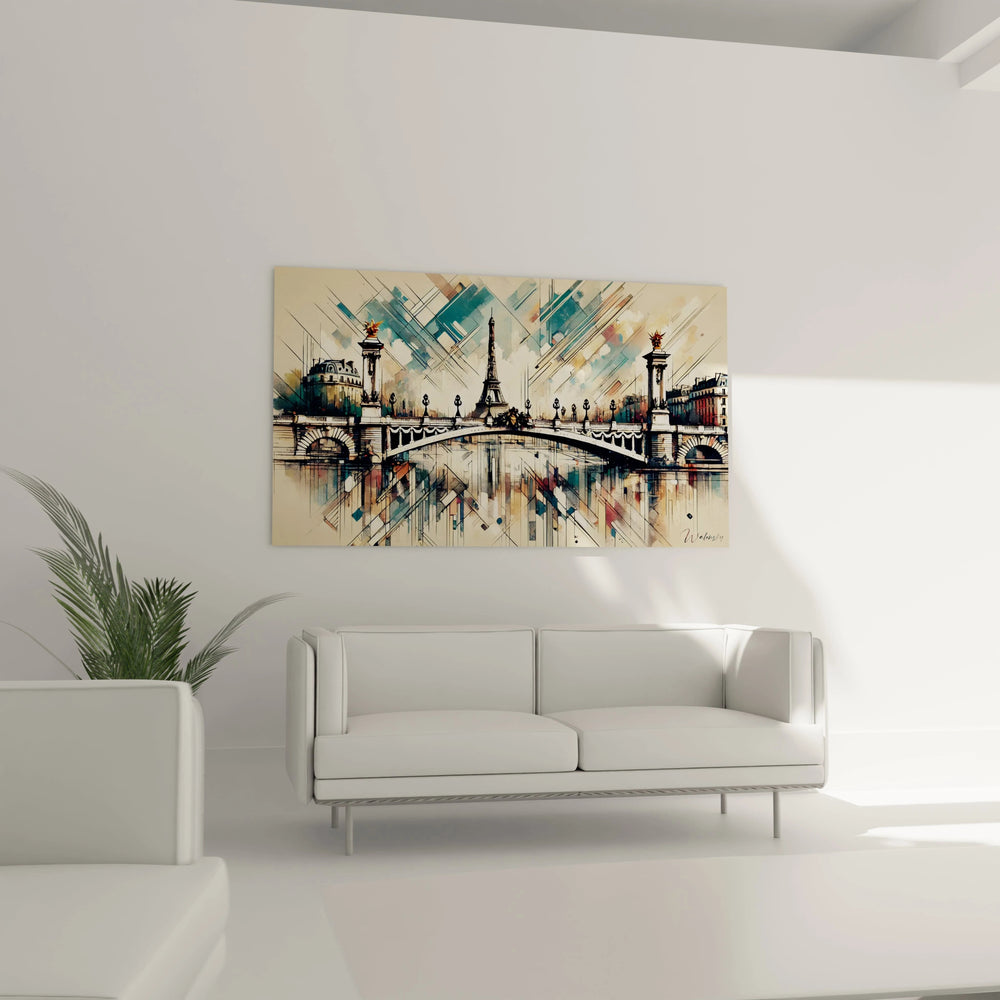 La composition mêle réalisme architectural et abstraction géométrique, créant un jeu de lignes et de textures qui semble animer le pont sous vos yeux. Vous sentez presque le murmure de la Seine à ses pieds et l’énergie élégante de la capitale française qui circule autour, enveloppant délicatement votre espace.
