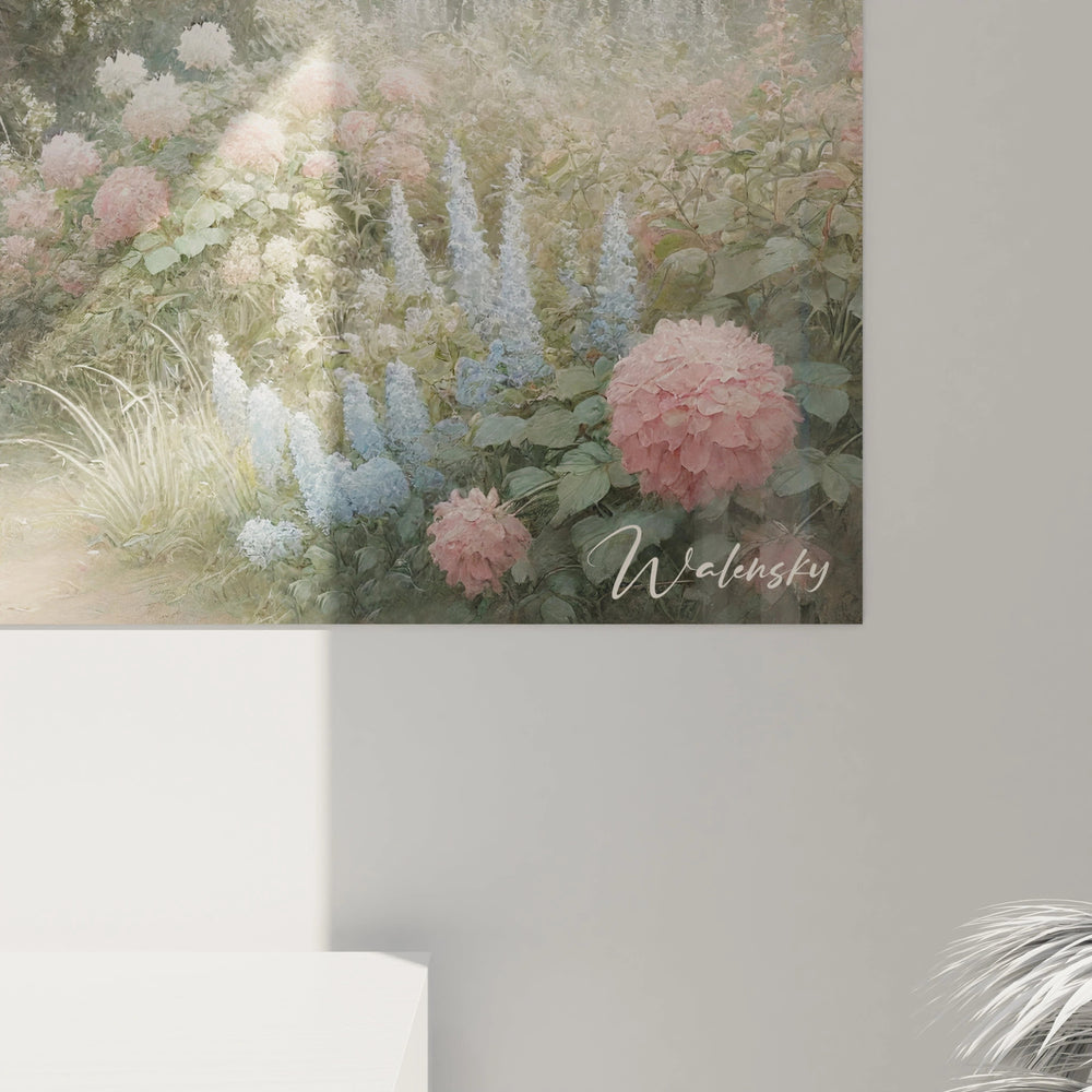 Ce tableau transcende le simple décor. Il vous transporte dans un jardin secret, baigné d’une lumière matinale qui caresse chaque pétale et chaque feuille. La présence des arches fleuries invite à la découverte, à ressentir l’apaisement d’un lieu où le temps semble suspendu. Vous vivrez l’expérience d’une promenade contemplative, là où la nature s’exprime avec élégance et délicatesse.