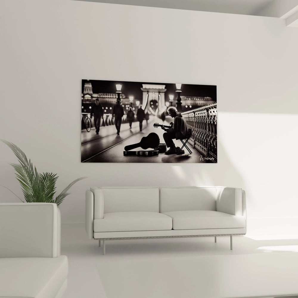 Imaginez un instant suspendu entre le bruissement discret de la ville et la douceur d’une guitare solitaire sous un ciel nocturne. Ce tableau noir et blanc vous transporte au cœur de cette poésie urbaine, où chaque ombre, chaque reflet sur le sol mouillé raconte une histoire d’émotions subtiles et de moments intimes.