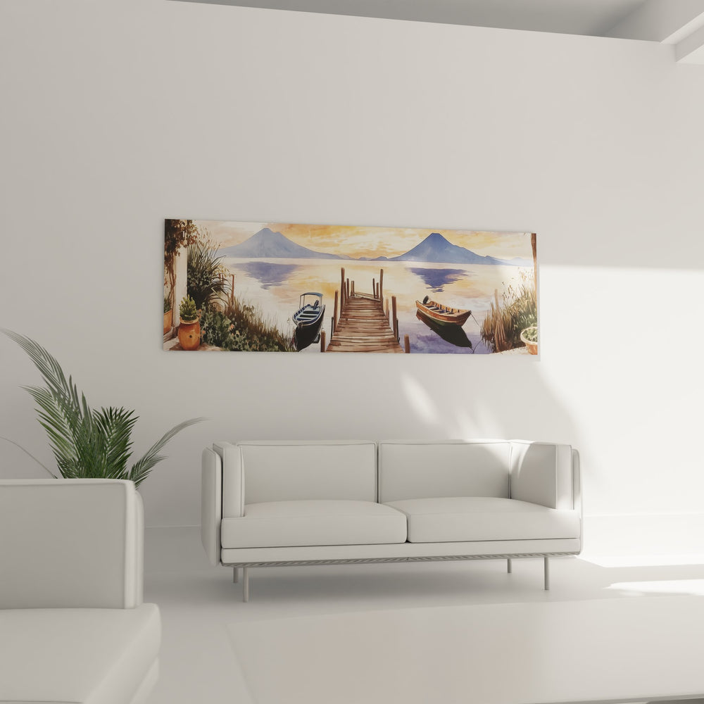 Ce magnifique tableau mural lac capture un moment de pure sérénité avec un ponton en bois s'avançant gracieusement vers les eaux calmes d'un lac majestueux. L'œuvre présente une composition harmonieuse où deux bateaux traditionnels se balancent délicatement de chaque côté du ponton, créant un équilibre parfait dans cette scène lacustre. Le coucher de soleil illumine l'ensemble de la toile d'une lumière dorée exceptionnelle, se reflétant sur la surface miroir du lac et créant des reflets chatoyants d'une beauté saisissante. Les montagnes en silhouette forment un arrière-plan dramatique, leurs contours bleutés se détachant élégamment contre le ciel embrasé. La végétation luxuriante qui encadre la scène, avec ses roseaux et plantes aquatiques disposés dans des poteries en terre cuite, ajoute une dimension naturelle et authentique à cette décoration murale nature. Cette toile lac panoramique évoque instantanément la tranquillité et l'évasion, transformant n'importe quel espace en véritable havre de paix. L'attention portée aux détails, des planches usées du ponton aux rides subtiles de l'eau, témoigne d'un travail artistique remarquable qui saura captiver le regard et apaiser l'âme.