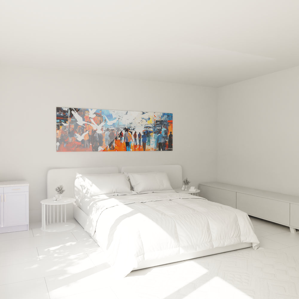 L'originalité de ce tableau port aux mouettes réside dans la capture d'un instant suspendu entre mouvement et contemplation. Les mouettes en vol créent une chorégraphie aérienne qui dialogue avec l'agitation terrestre des promeneurs. La signature visible dans l'angle inférieur droit atteste de l'authenticité de cette création. Cette art mural maritime se distingue par son approche non idéalisée de la scène portuaire : elle montre la réalité contemporaine sans nostalgie romantique. Les personnages anonymes, traités en silhouettes colorées, universalisent la scène et permettent à chaque spectateur de s'y projeter. La dimension panoramique accentue l'effet cinématographique de l'ensemble.