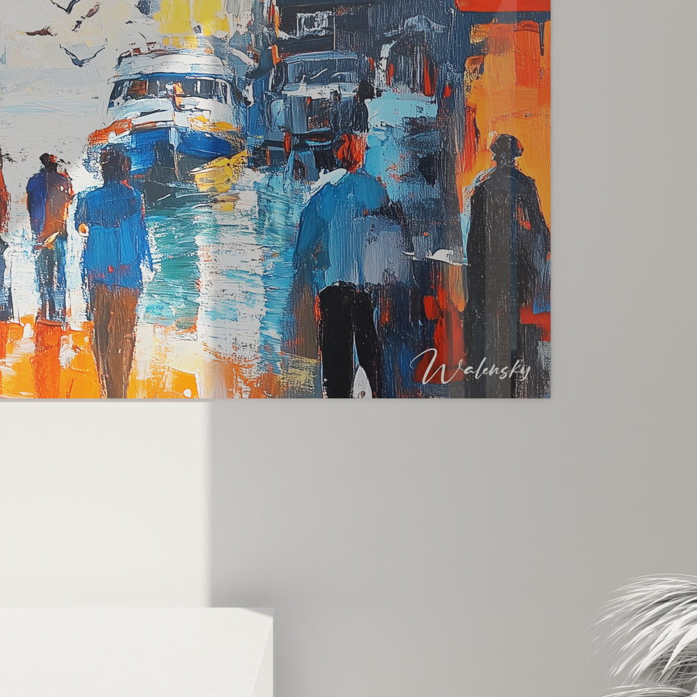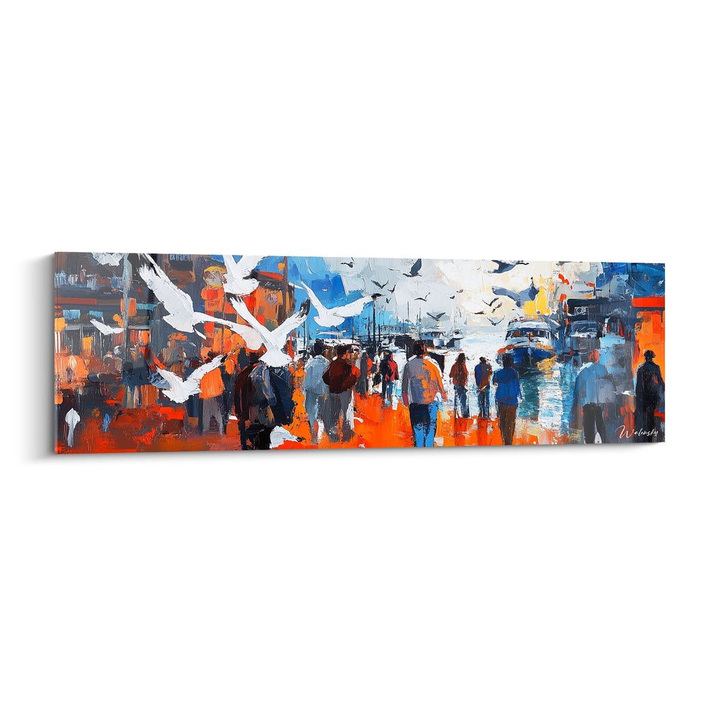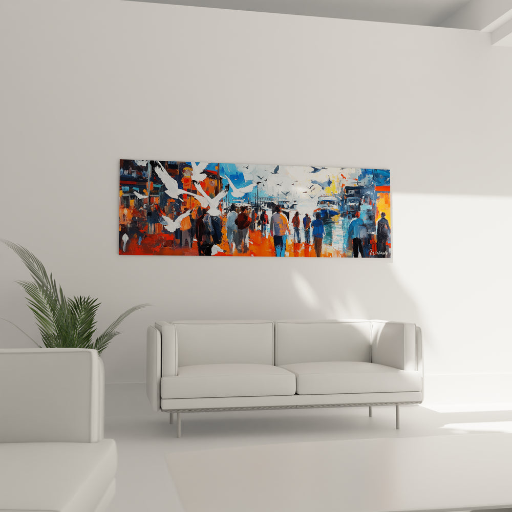 Ce tableau port présente une scène maritime contemporaine où se mélangent harmonieusement l'activité humaine et la nature. L'œuvre capture un moment de vie portuaire avec une approche impressionniste moderne, mettant en scène des personnages en mouvement sur les quais. Les mouettes en vol dominent la partie supérieure de la composition, créant un contraste saisissant avec l'agitation terrestre. Cette décoration murale port se distingue par son format panoramique qui amplifie la sensation d'immersion dans l'environnement maritime. Les reflets sur l'eau et les silhouettes humaines stylisées confèrent à cette œuvre une dimension poétique unique.