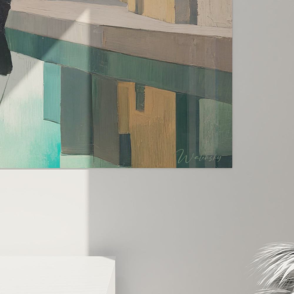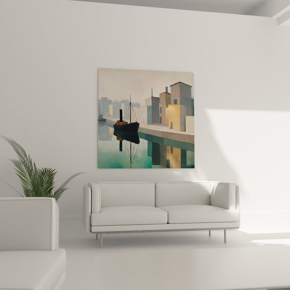 Cette œuvre d'art captivante présente un tableau port industriel d'une beauté saisissante, où l'architecture urbaine se mélange harmonieusement avec l'environnement maritime. Au premier plan, un bateau à vapeur vintage noir aux lignes élégantes flotte paisiblement sur des eaux translucides aux reflets turquoise et émeraude. Ce tableau mural port révèle un quai en béton massif qui s'étend le long de la composition, créant une perspective géométrique parfaite. Les bâtiments industriels colorés qui bordent le port forment un ensemble architectural fascinant, avec leurs façades déclinées dans des tons de gris, beige, orange vif et bleu pastel. Chaque structure révèle une identité propre tout en s'intégrant dans cette scène portuaire harmonieuse. L'arrière-plan dévoile une skyline urbaine aux contours doux, baignée dans une atmosphère brumeuse qui confère une profondeur remarquable à cette peinture de port moderne. Les reflets parfaits du navire et des bâtiments dans l'eau créent un effet miroir saisissant, doublant visuellement la richesse de la composition. Cette décoration murale maritime capture l'essence même de l'activité portuaire industrielle tout en conservant une esthétique apaisante et contemplative, idéale pour sublimer un intérieur contemporain.