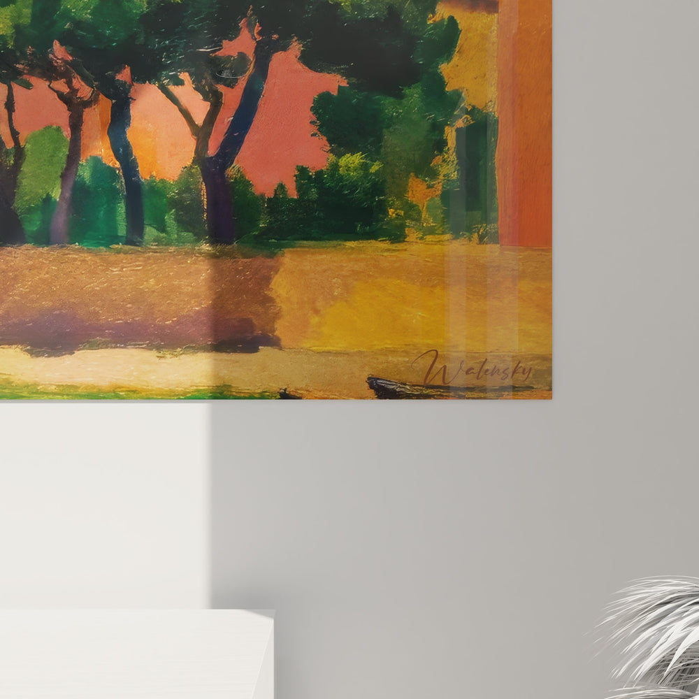 Ce tableau mural port méditerranéen capture avec brio l'essence d'un village côtier baigné de soleil. L'œuvre présente un paysage portuaire pittoresque où se mélangent harmonieusement architecture traditionnelle et marine paisible. Les façades colorées dominent la composition avec leurs teintes chaudes : rouge corail, jaune ocre, rose saumon et orange lumineux qui évoquent l'authenticité des villages de la Méditerranée. Au premier plan, plusieurs embarcations de pêche reposent tranquillement sur les eaux bleu azur, témoignant de l'activité maritime locale. Les pins parasols caractéristiques ponctuent le paysage de leur vert profond, créant un contraste saisissant avec les tons chauds des bâtiments. Cette peinture de port coloré révèle une technique picturale moderne où les formes sont simplifiées et les couleurs exaltées. L'artiste a su restituer l'atmosphère unique des ports de Méditerranée, entre tradition et modernité artistique. Les volumes architecturaux sont traités avec une géométrie douce qui confère à l'ensemble une dimension contemporaine tout en préservant l'authenticité du sujet. Ce tableau décoratif maritime transforme instantanément l'espace en fenêtre ouverte sur un monde méditerranéen enchanteur.